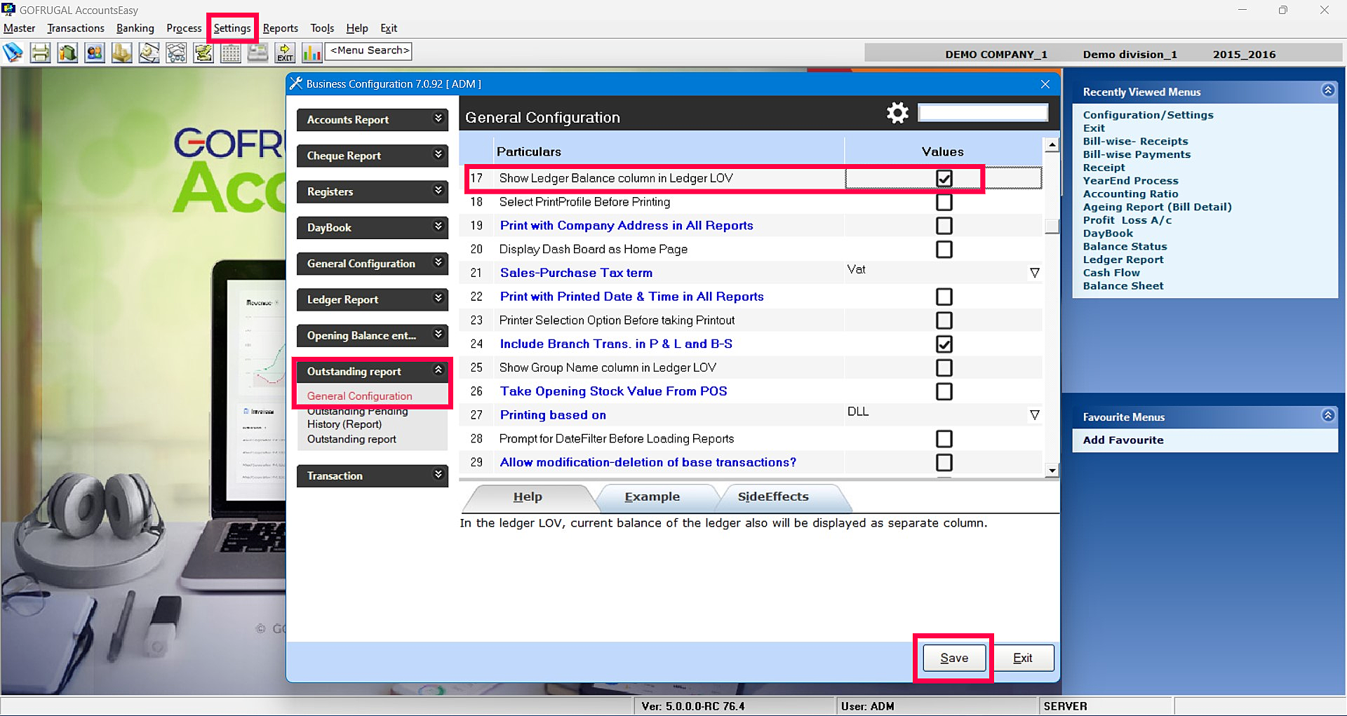 Step 1: In AccountsEasy screen, Go to Settings > Configuration > Show Ledger Balance column in Ledger LOV (Enable) > Save