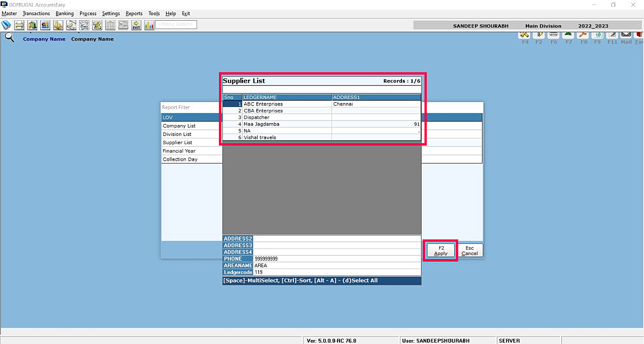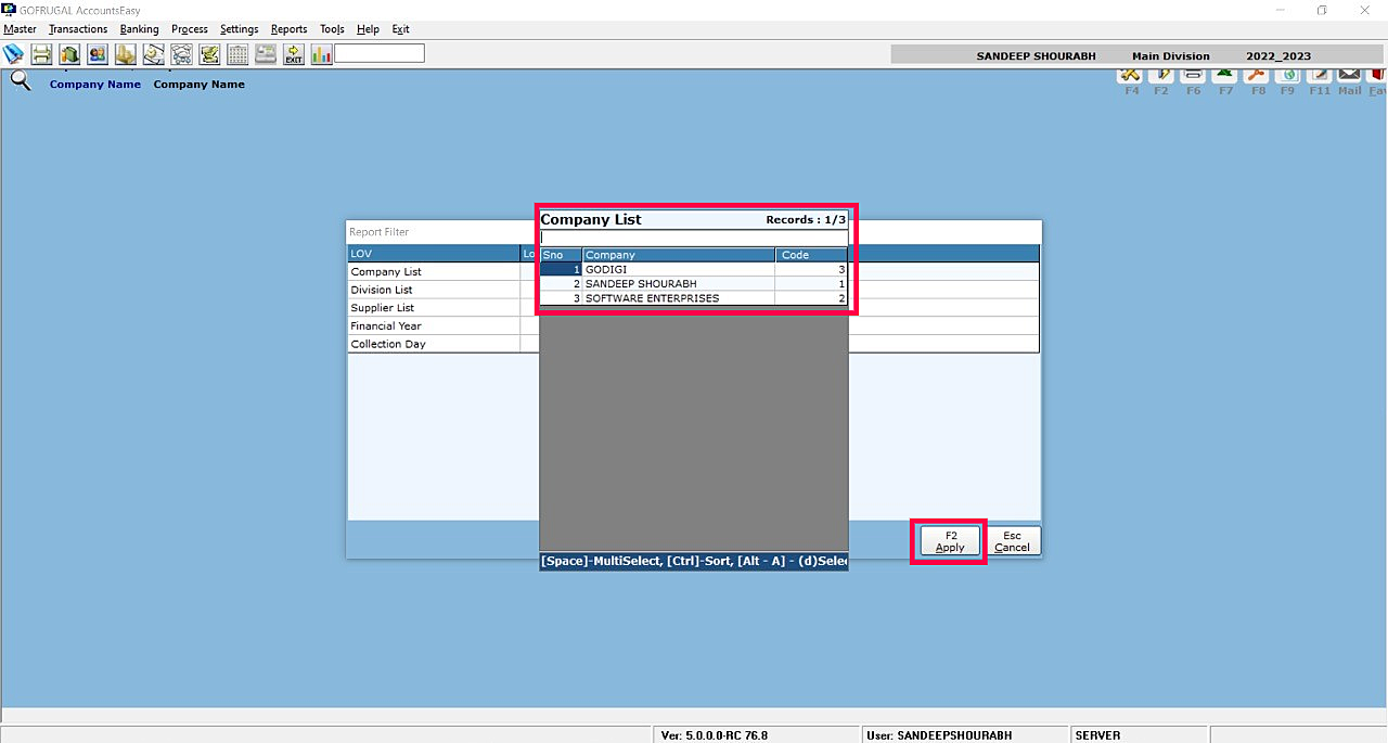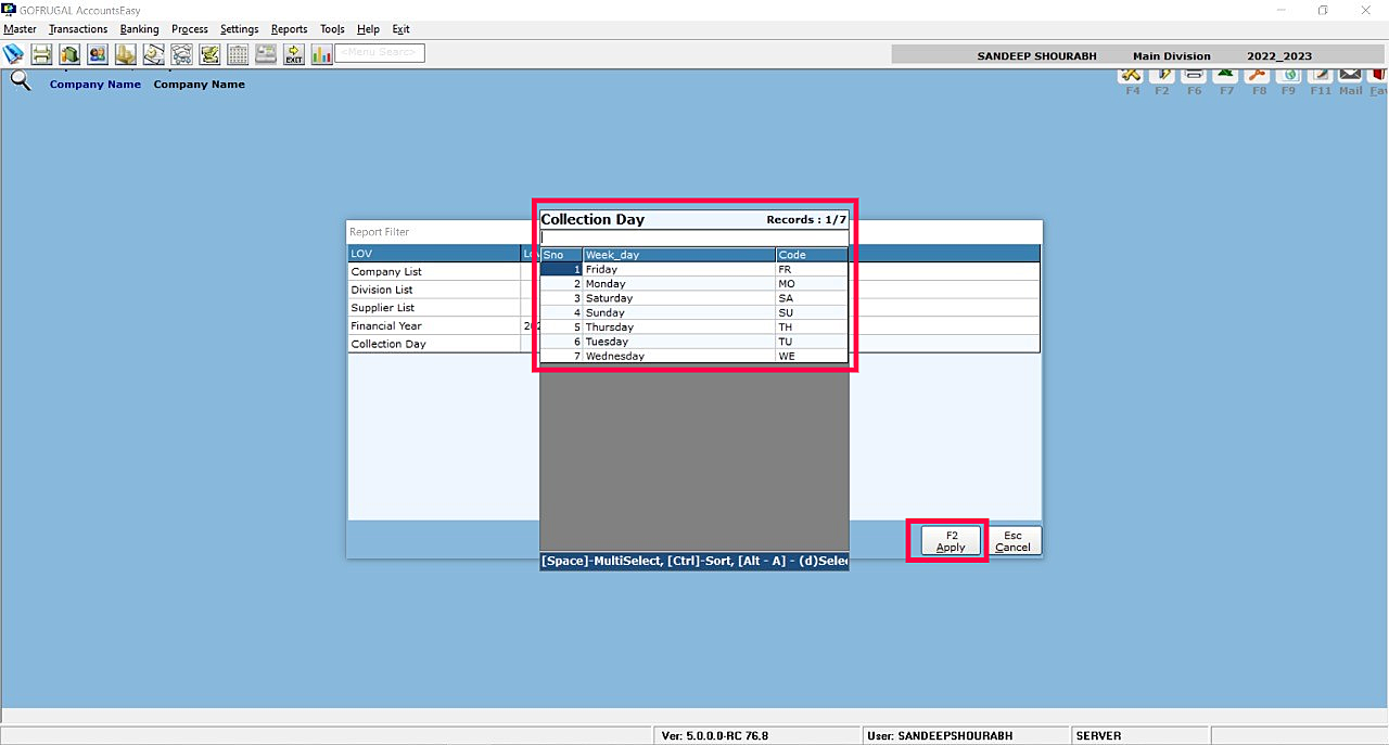 Step 4: Report Filter Screen will appear where need select the listed LOV and click Apply (F2).