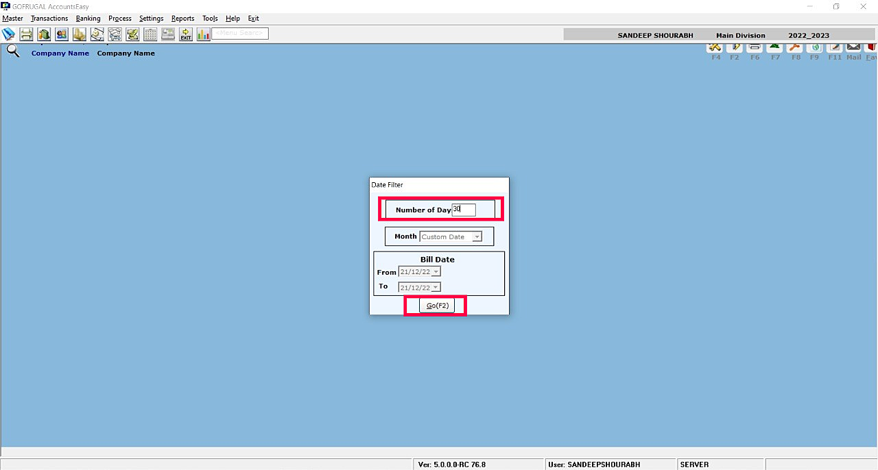 Step 3: A new screen will appear, here need to mention the Number of Days & click Go(F2).