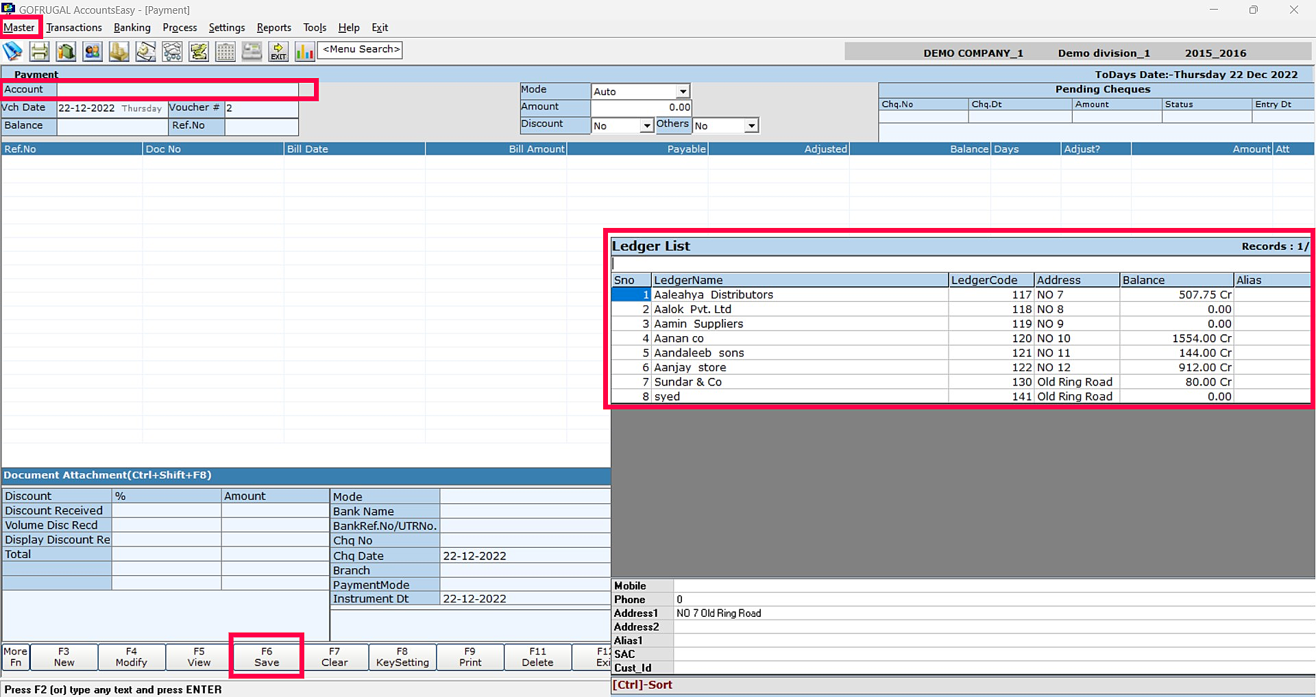 Step 2: Go to Masters > Payment, Payment Screen will appear and select the Supplier from the Ledger List. Here also we can check the Supplier Outstanding