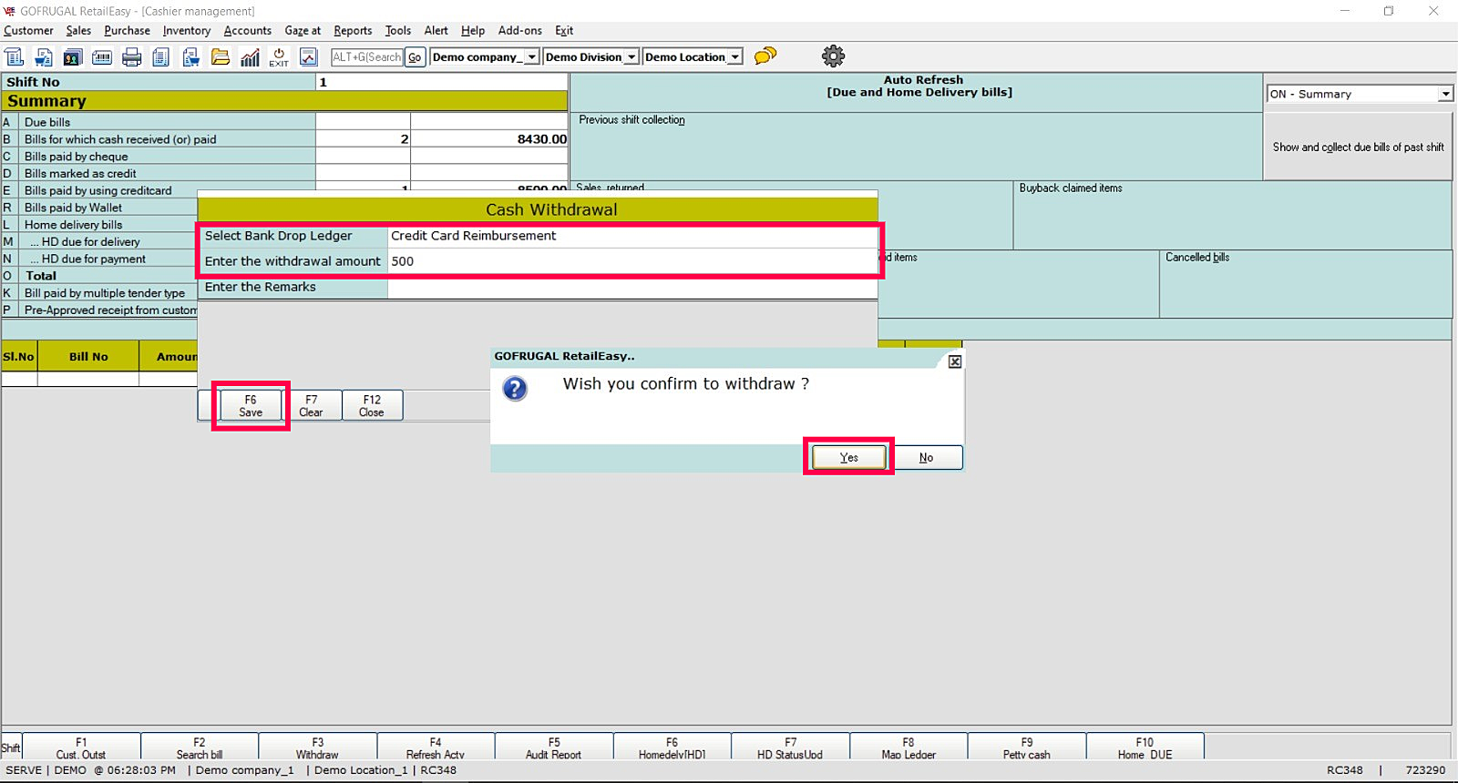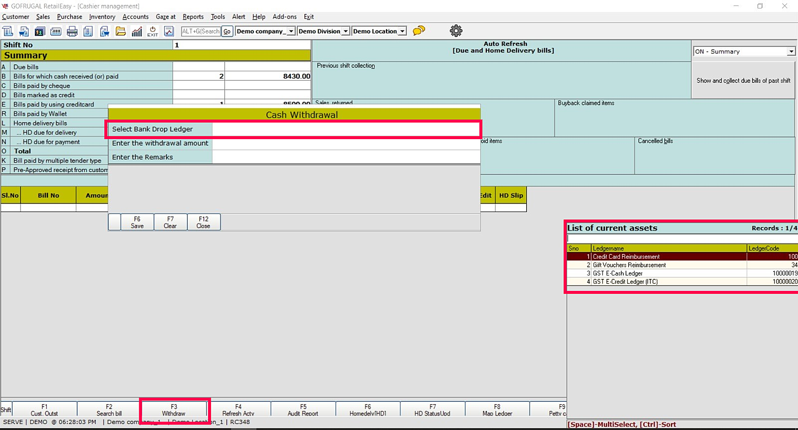 Step 2: Cashier Management screen will appear. Click on the 'Withdraw' function key, 'Cash Withdrawal' screen will appear. Select the Bank Drop Ledger from LOV.