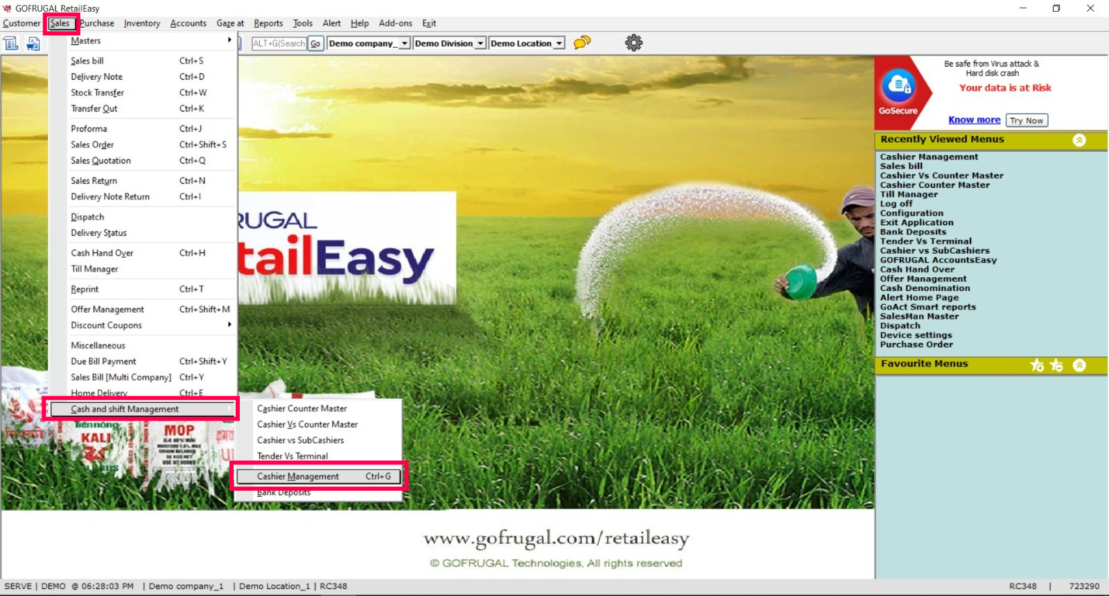 Step 1: Go to Sales > Cash and Shift Management > Cashier Management