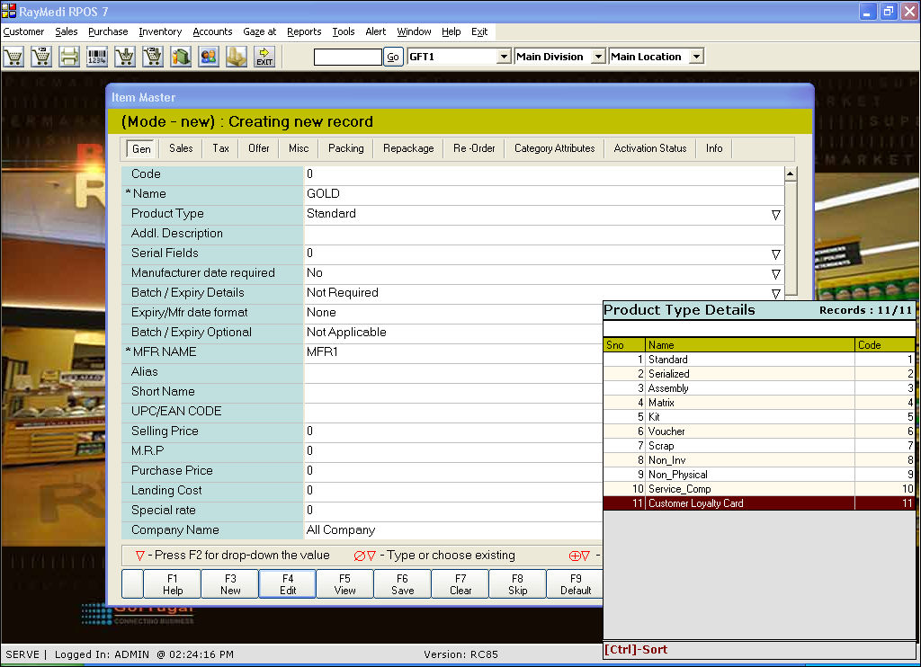 Note: Enter the required information in the other mandatory fields viz. MFR Name, Sales Tax, Purchase Tax and Main Distributor.