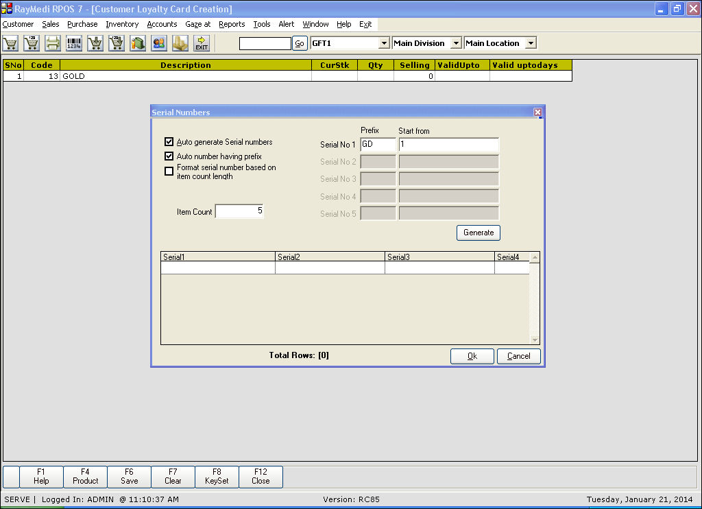 f. Click Generate to generate the serial numbers for the selected card