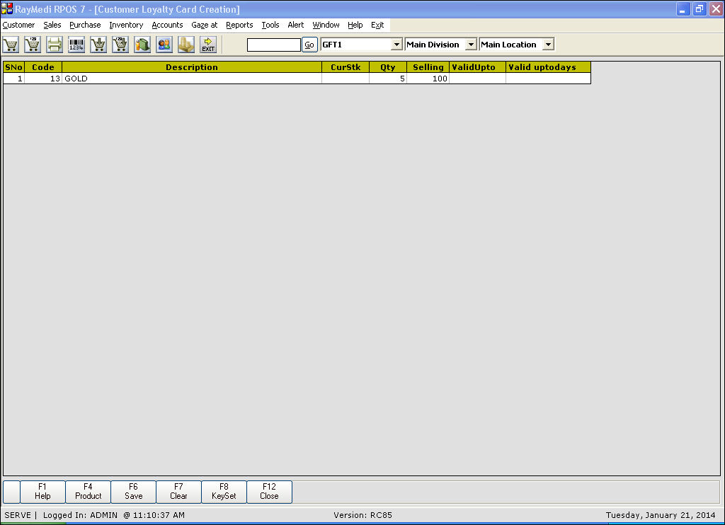 ii. In the Product Type field, press ENTER or double click the mouse to view a list of product type. Select the option Customer Loyalty Card