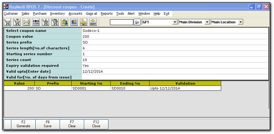 11. Press F2[Generate] key to generate the Discount Coupon series.