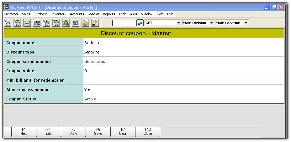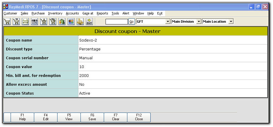 1. Click Sales >> Discount Coupons >> Discount Coupon - Master to open the Discount Coupon - Master screen.