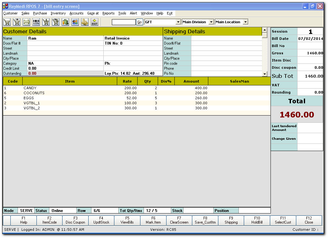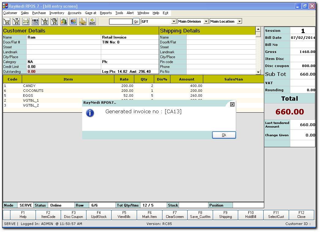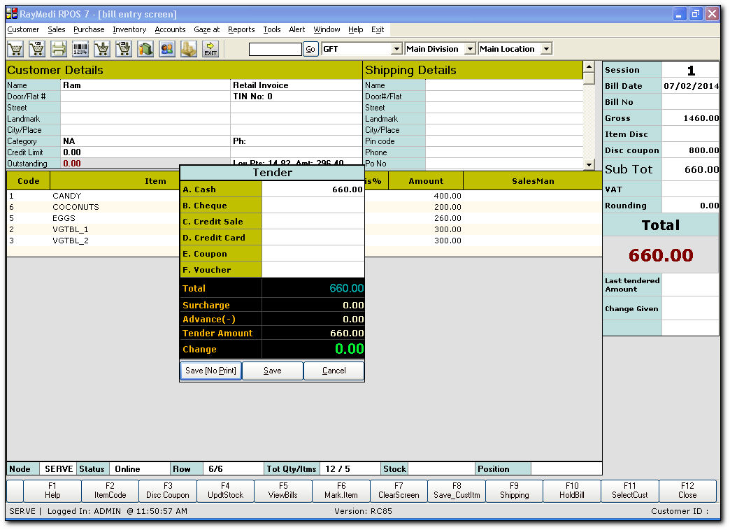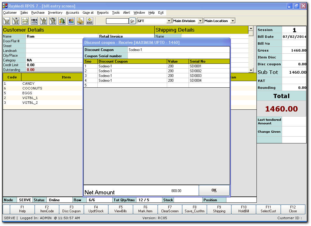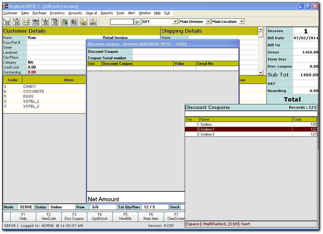 2. Press F3 [Disc Coupon] key to view the Discount coupon redemption screen after loading the item(s) on the bill entry screen.