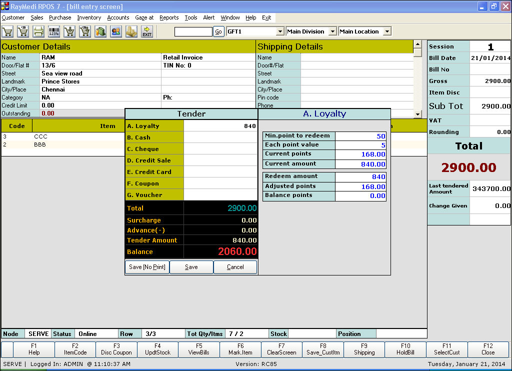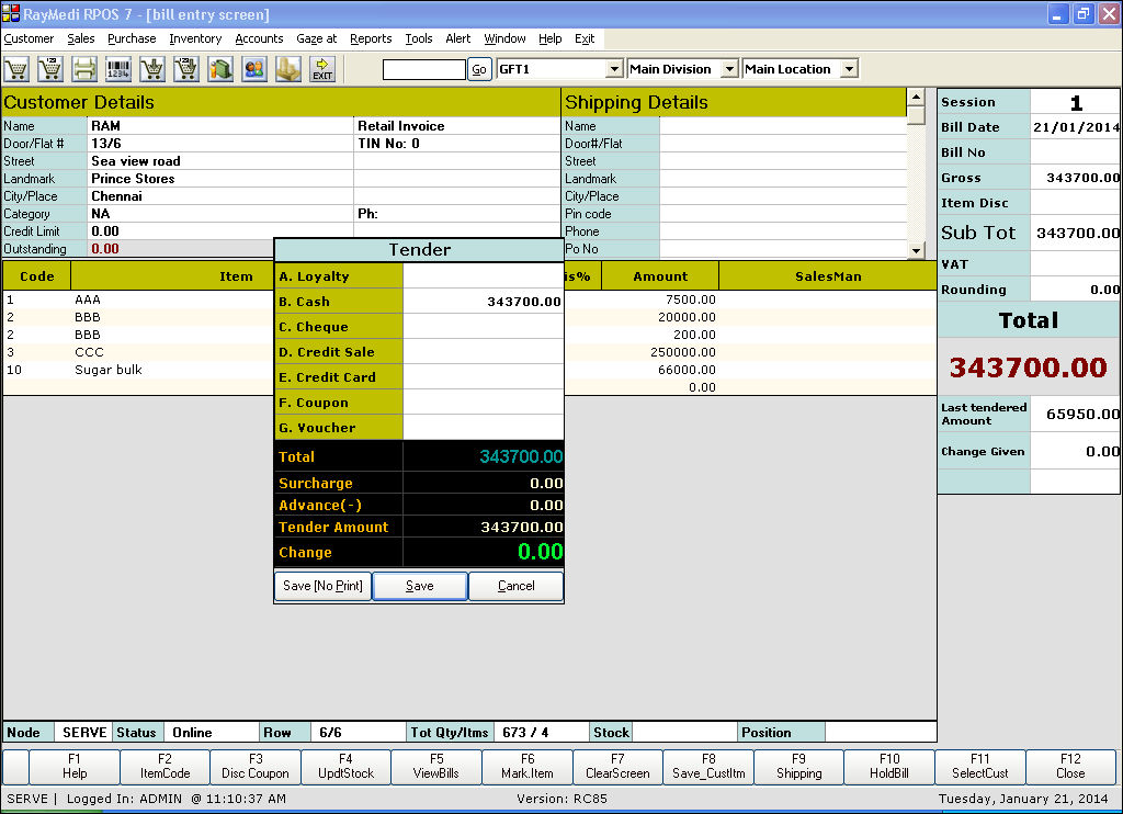 b. Press Esc or * key or Shift + F1 key to invoke tender after loading the items for billing.