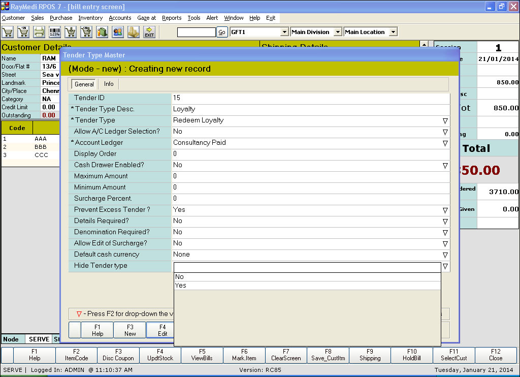 a. In the Tender Type field, press ENTER or F2 key or double click the mouse to select the tender type. Select the option Redeem Loyalty.
