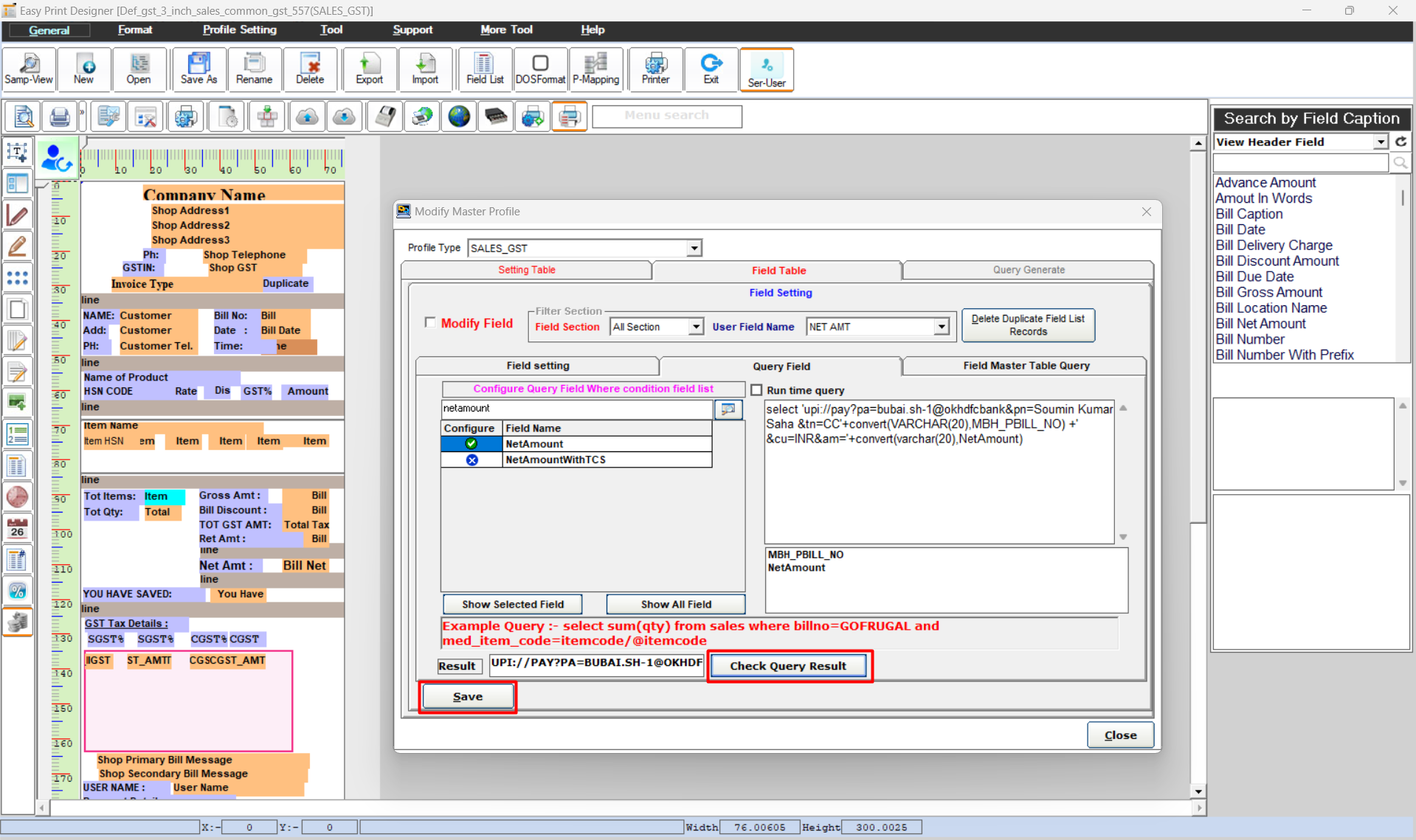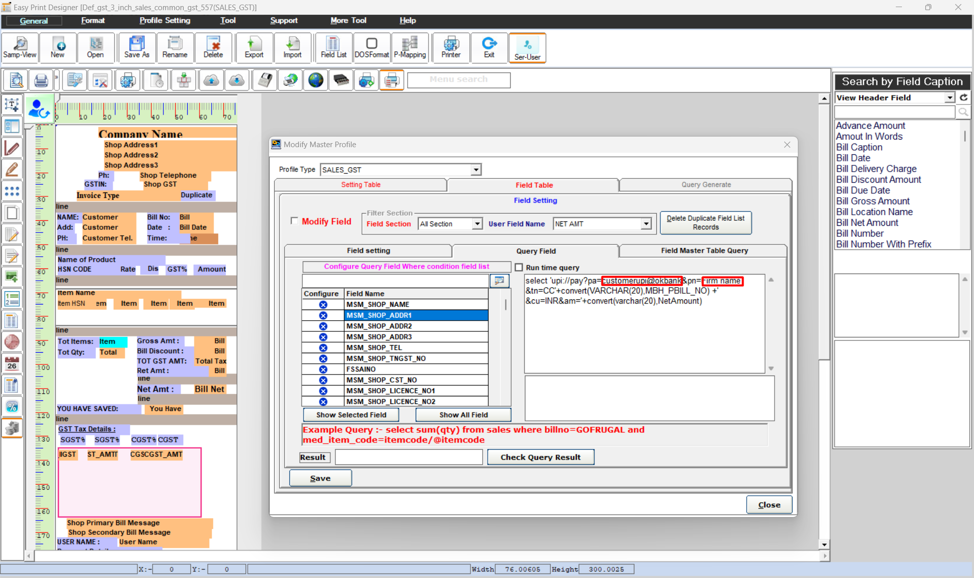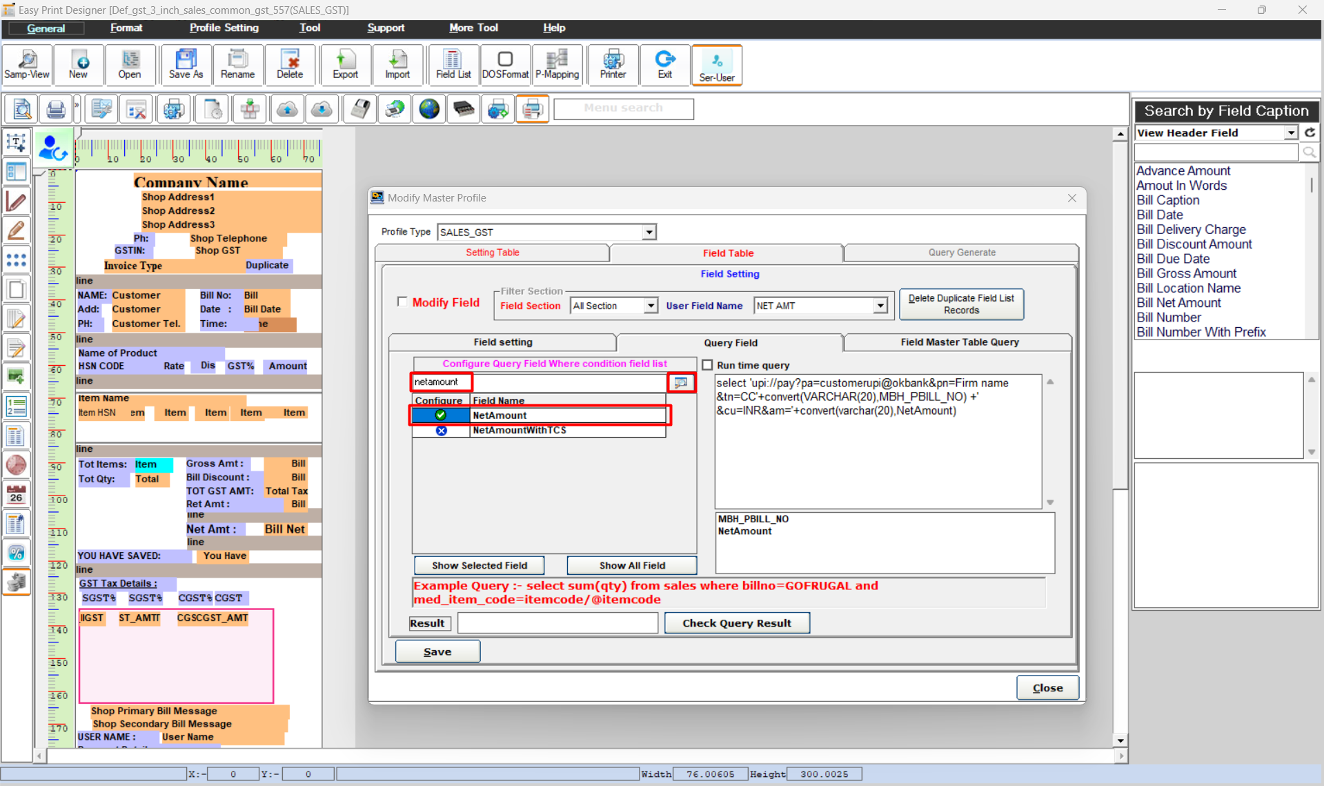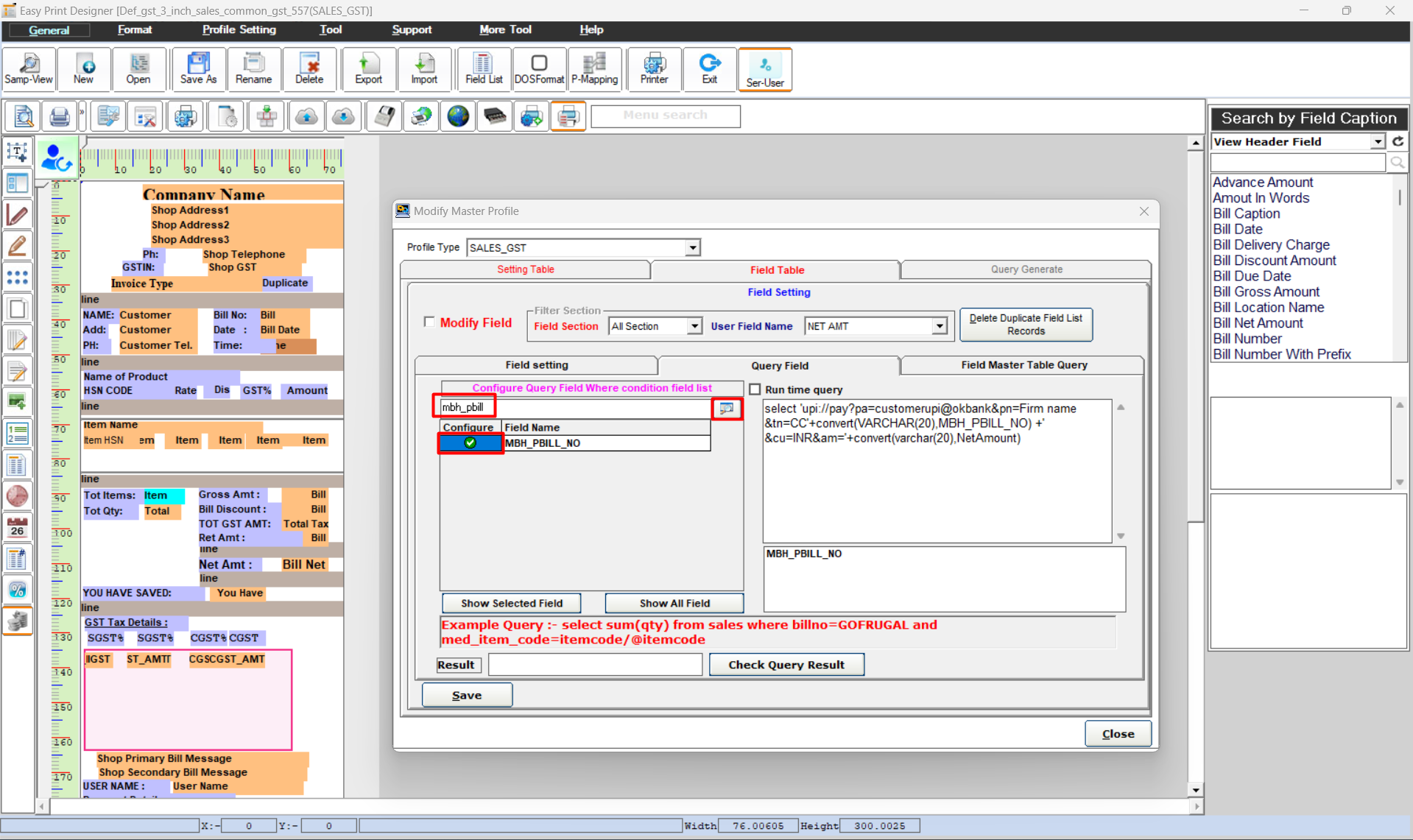 Step 8: After entering the query, map the "MBH_PBILL_NO" and "NetAmount" from the field list on the left side. To map the field names, type the field names ["MBH_PBILL_NO" & "NetAmount"] into the search bar and click the search button. Double-click the field name to complete the mapping.