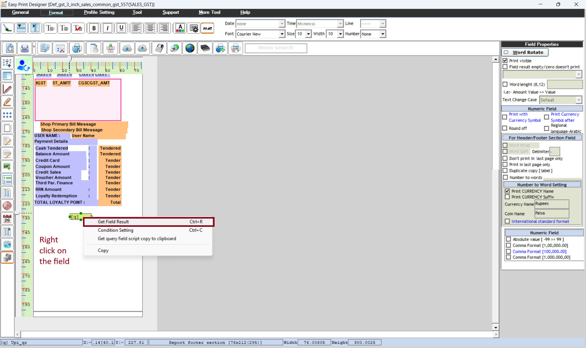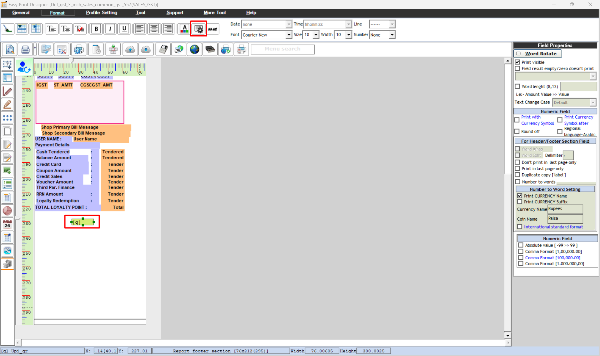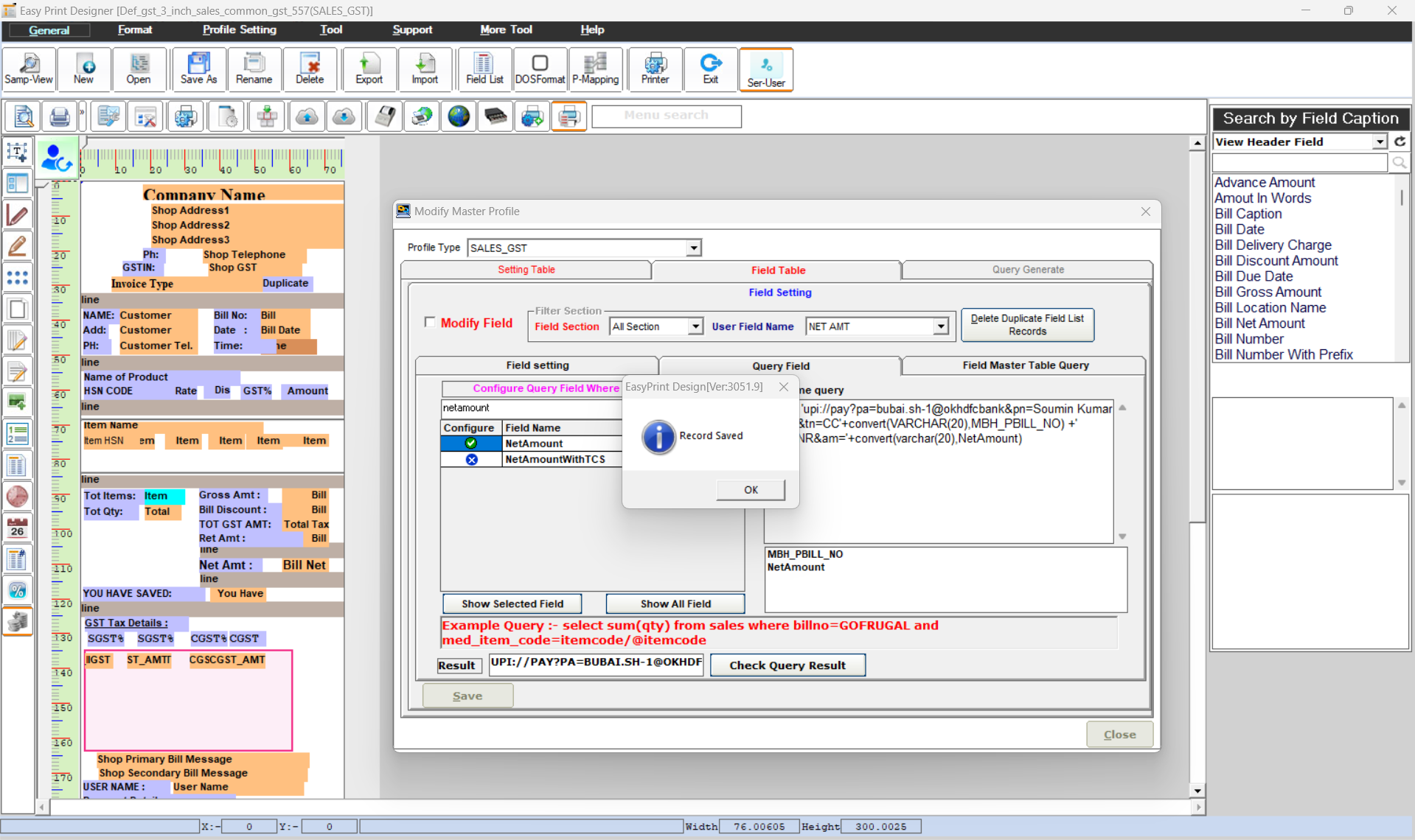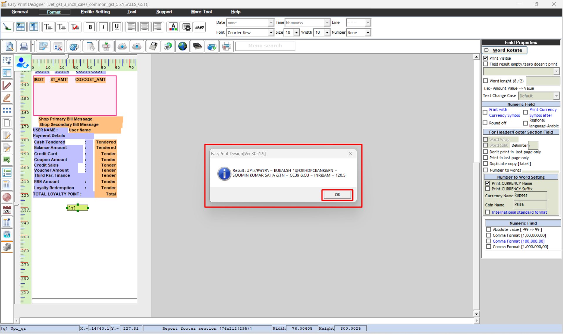 Step 11: Search for the keyword "UPI" and then click on the field and drag it to the design area where you want to display the QR code.