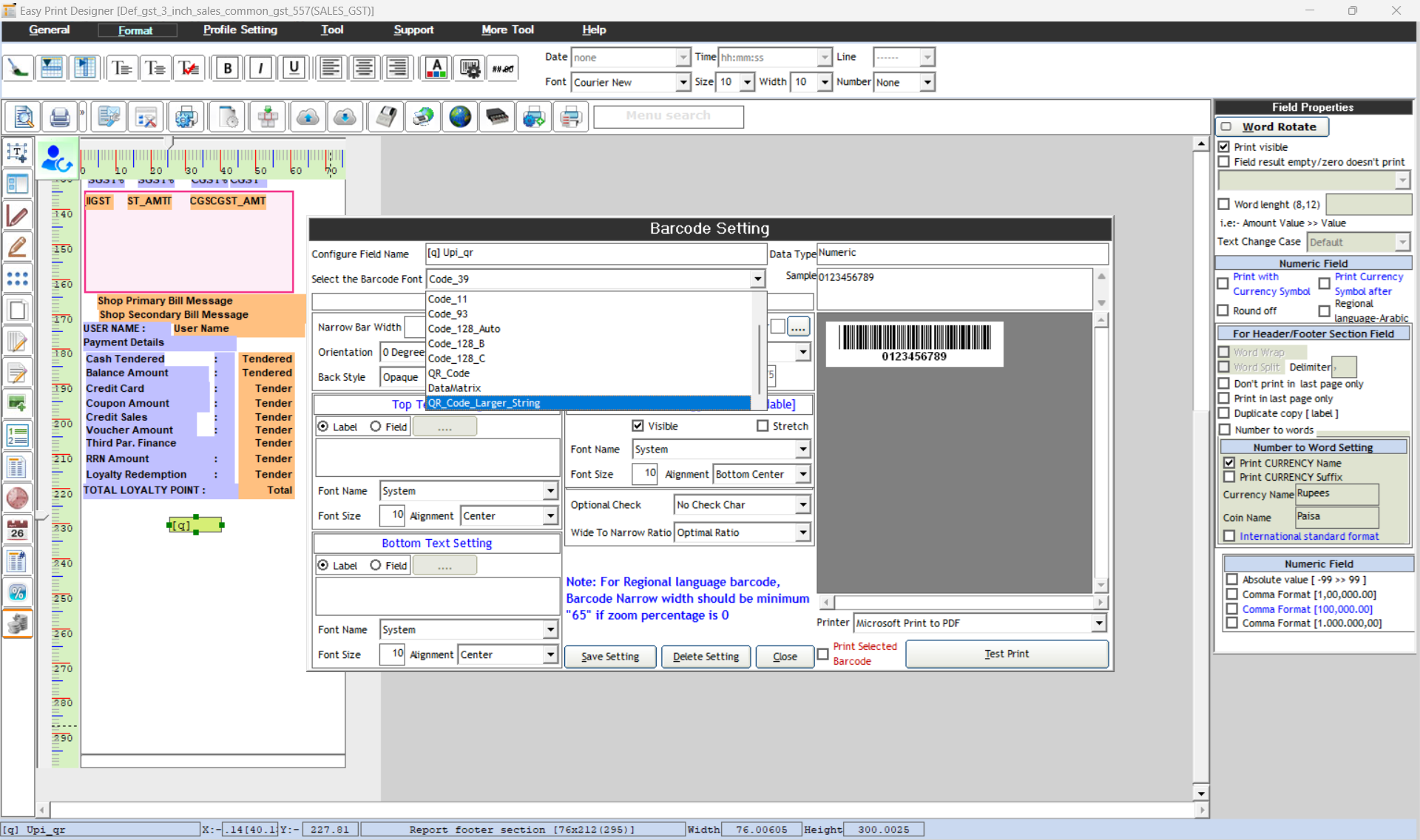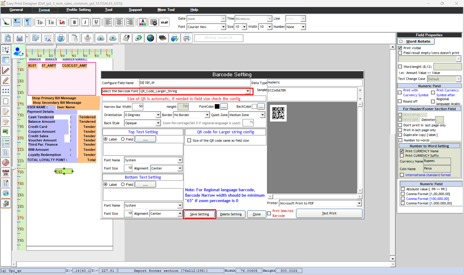 Step 14: In the barcode settings screen, select the barcode font "QR Code Larger String" and save the settings.