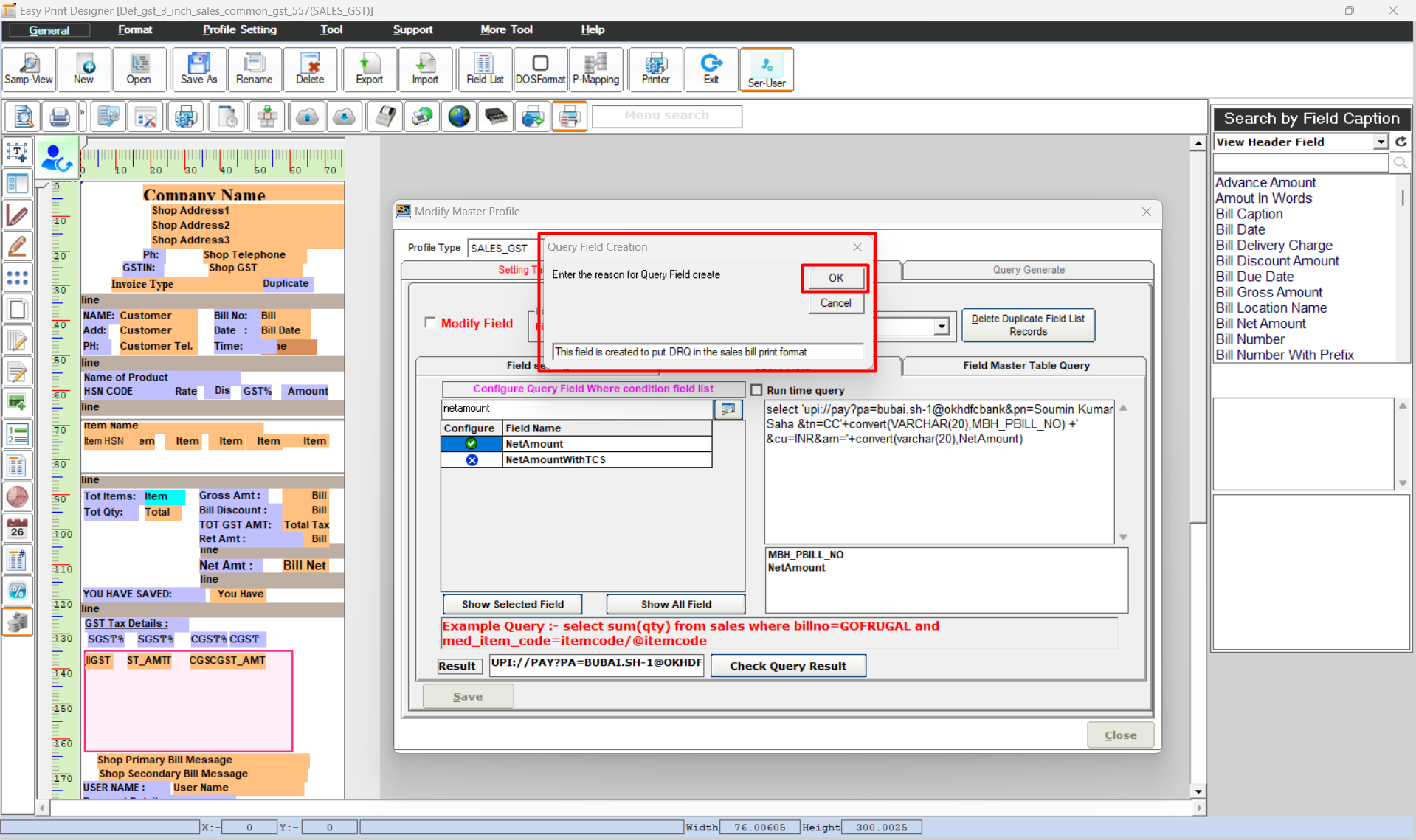 Click on the OK button. The query field will now be available in the field list on the print design screen.