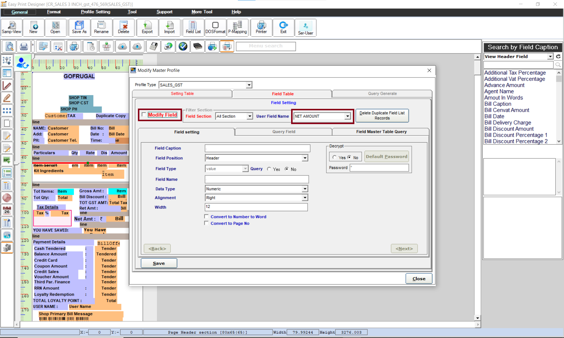 Step 5: Click on "Modify Field" and select the "Net Amount" field from the user field name list. After selecting the field, disable the "Modify Field" option to create a new field.