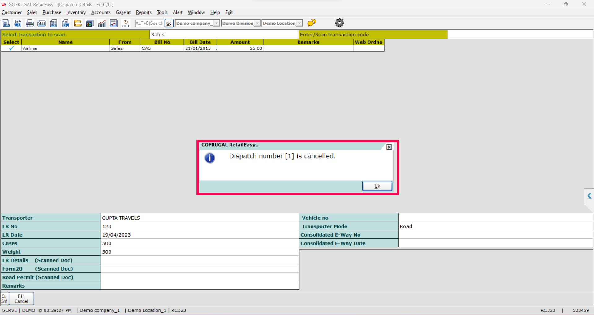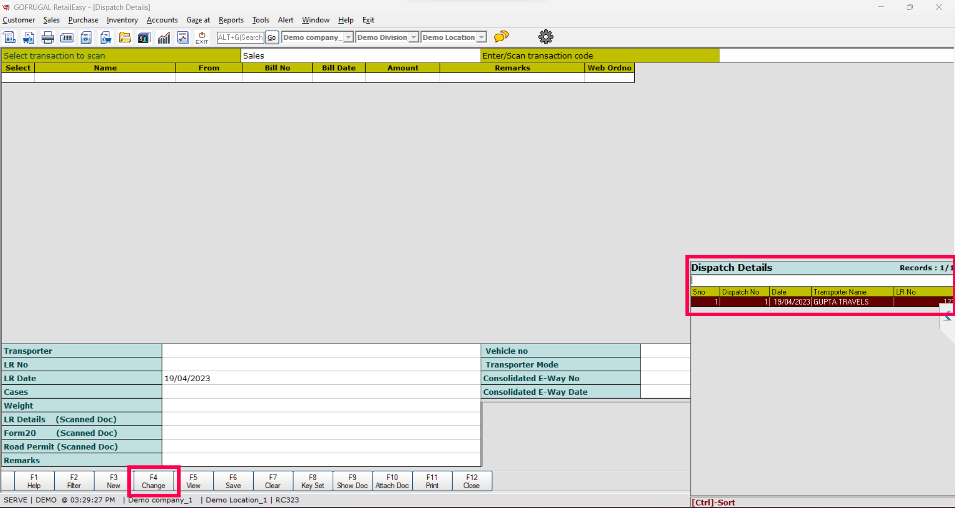 Step 2: Dispatch Detail screen will appear. Click 'Change' function key > Dispatch Details screen will appear and choose the required bill from LOV.