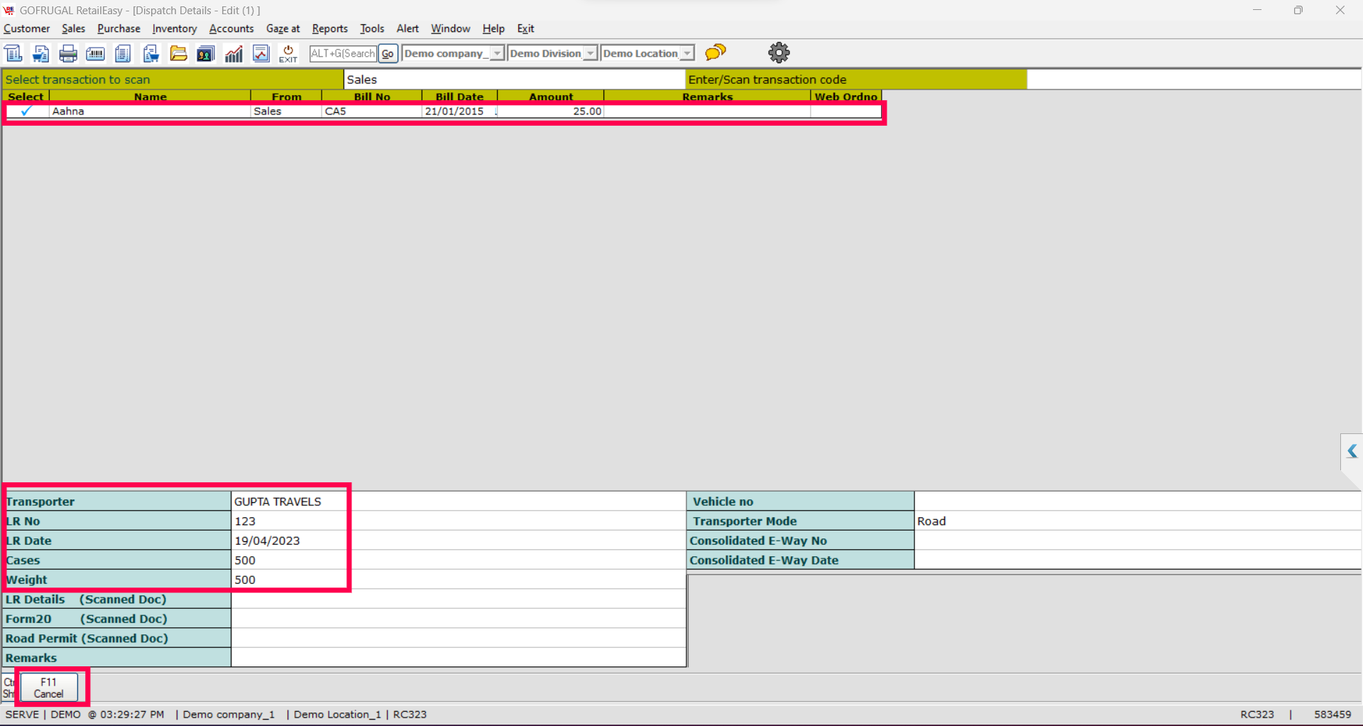 Step 3: Listed Name & Transporter Detail will appear. Click space-bar and select the Name (Blue tick) appears. Click 'Cancel' function key.