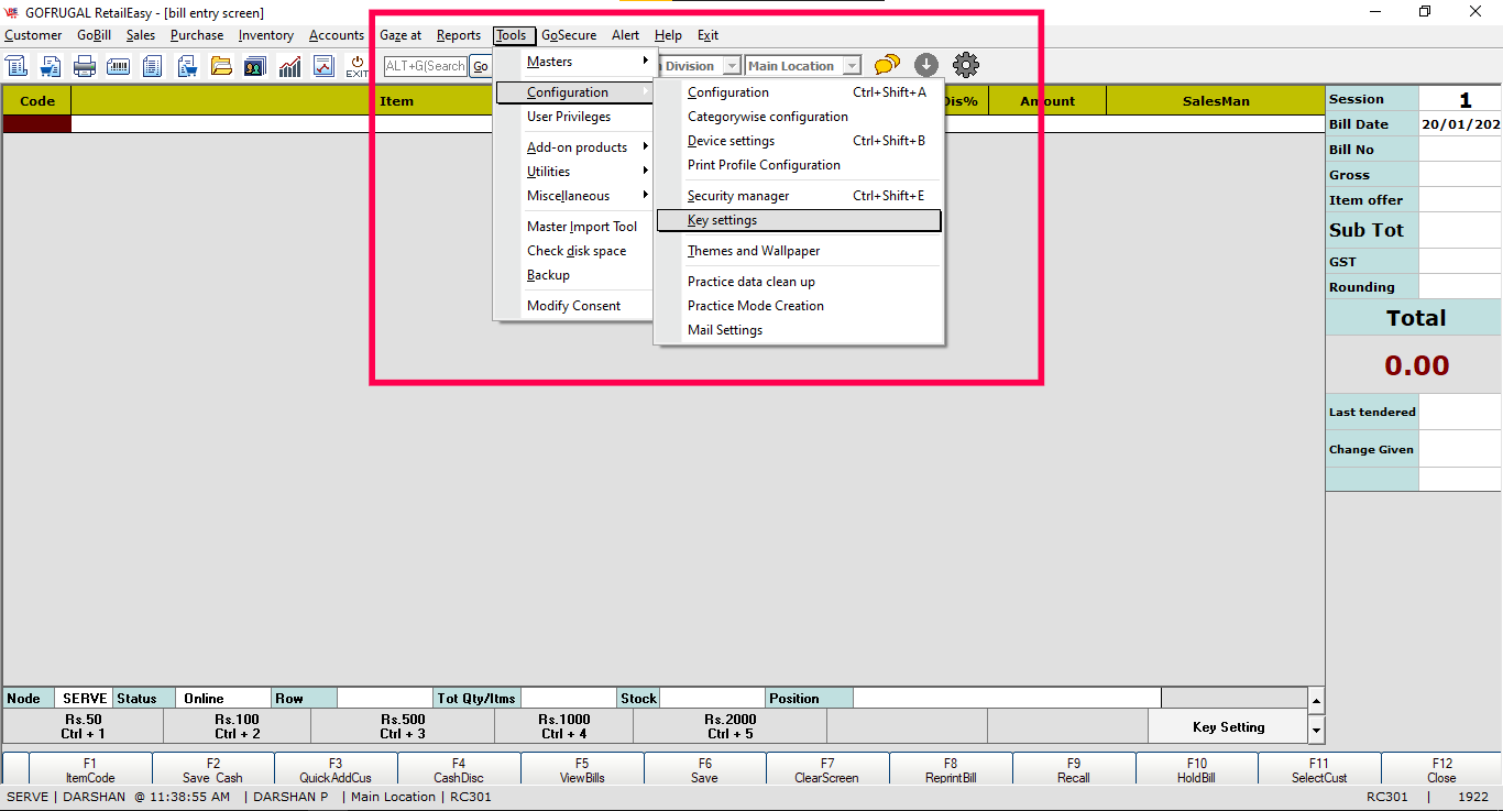 Step 1: Navigate through Tools -> Configuration -> Key settings