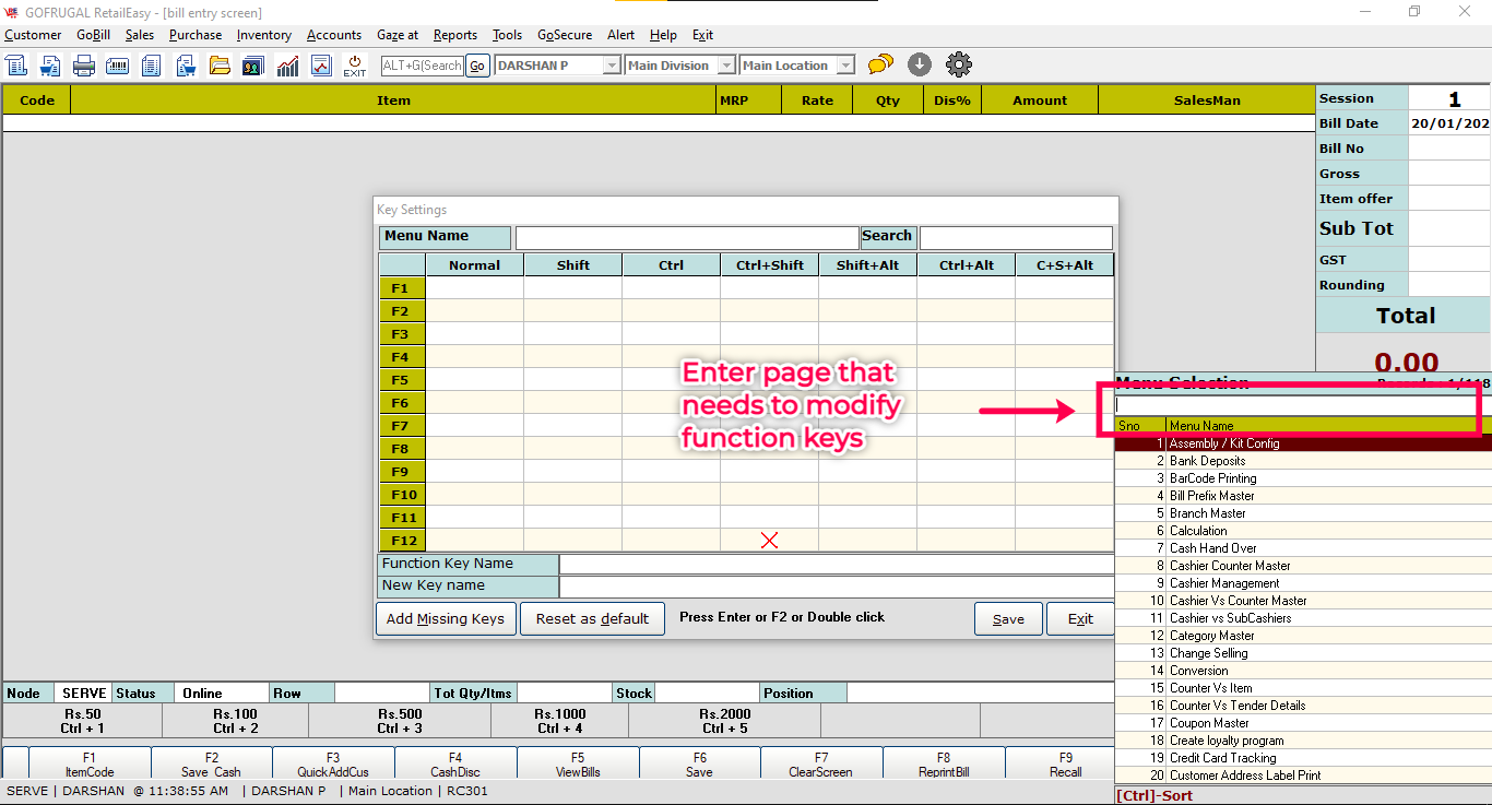 Step 2: Choose the page where the function keys need to be modified in the menu path. For example, let's modify the function keys on the Sales Bill screen.