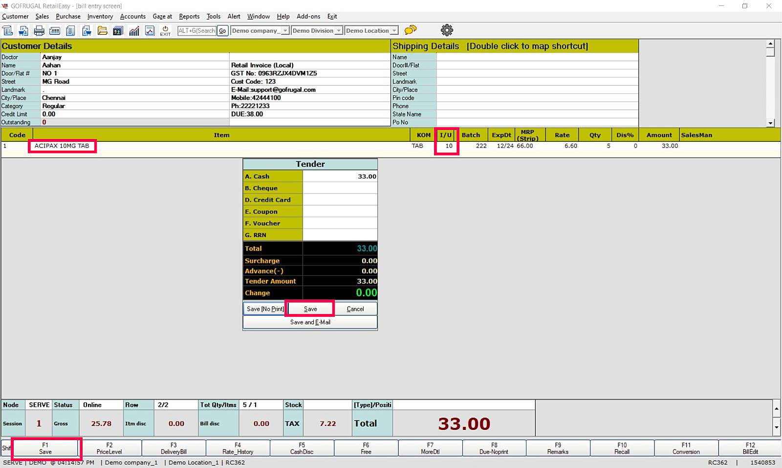 Step 2: Bill Entry screen will appear. Select Customer and load the items. Check for the I/U details. Click Save.