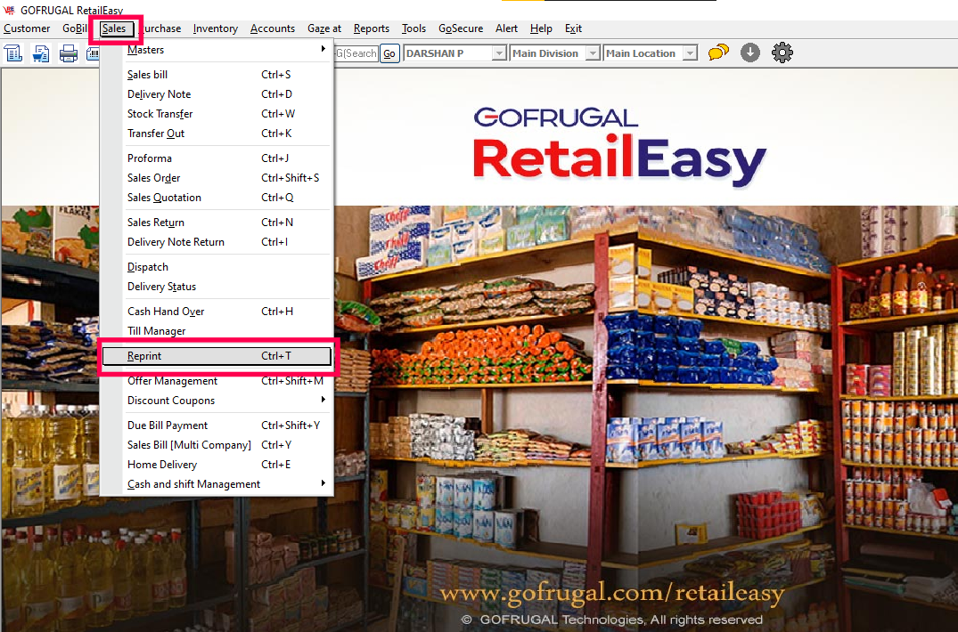 Step 1: Navigate through Sales -> Reprint.