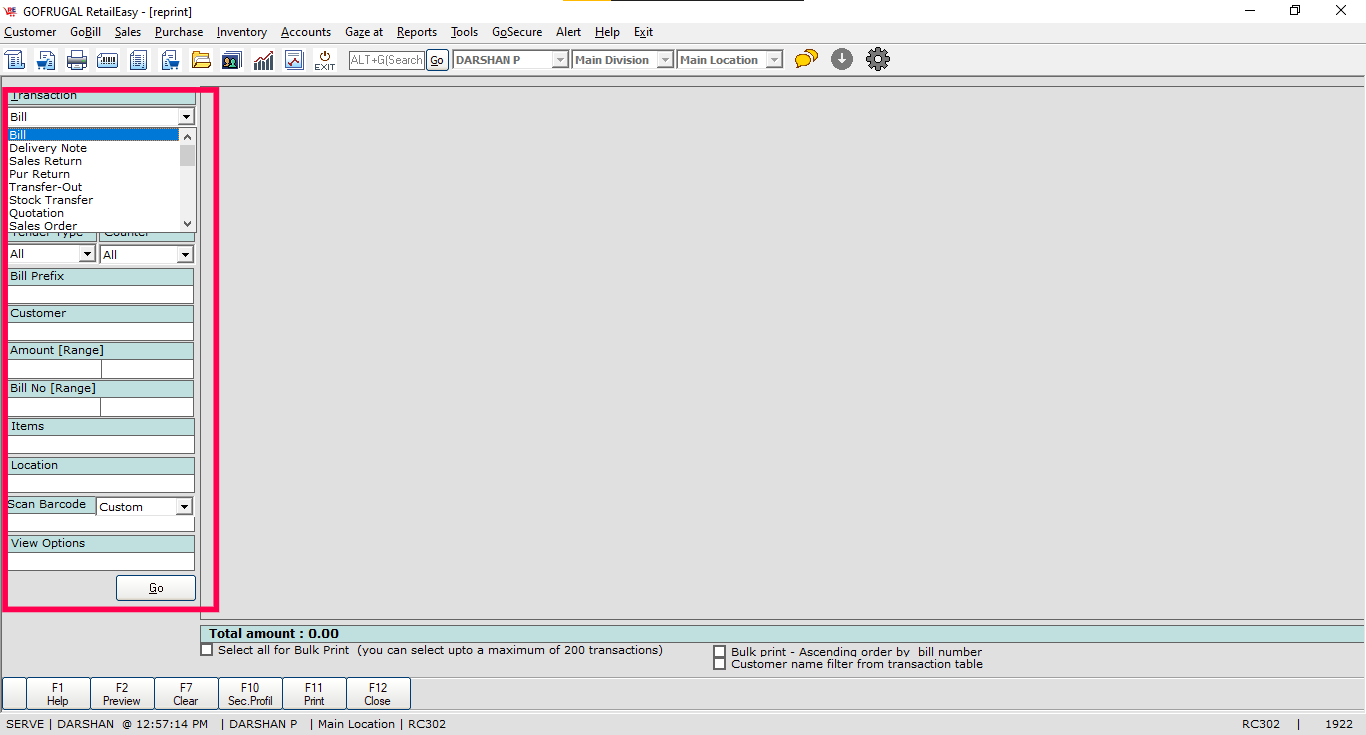 Step 2: Enter the transaction type and the details of the bill in the filter to generate a bill for mapping to the printer.