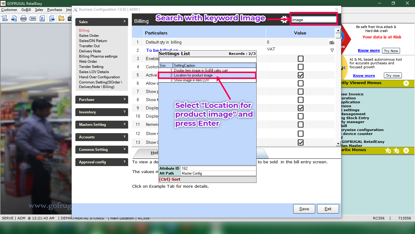 Step 3: In the top search bar search with keyword "Image" and press Enter. From the list, select "Location for product image" and press the Enter button.