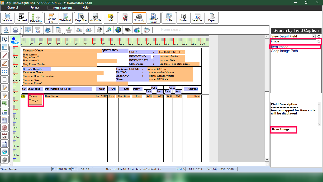 Step 3: Edit the Print Profile and in the Search by Field Caption, search with the keyword "Image". Drag that field and put it in the detail section of the print profile.