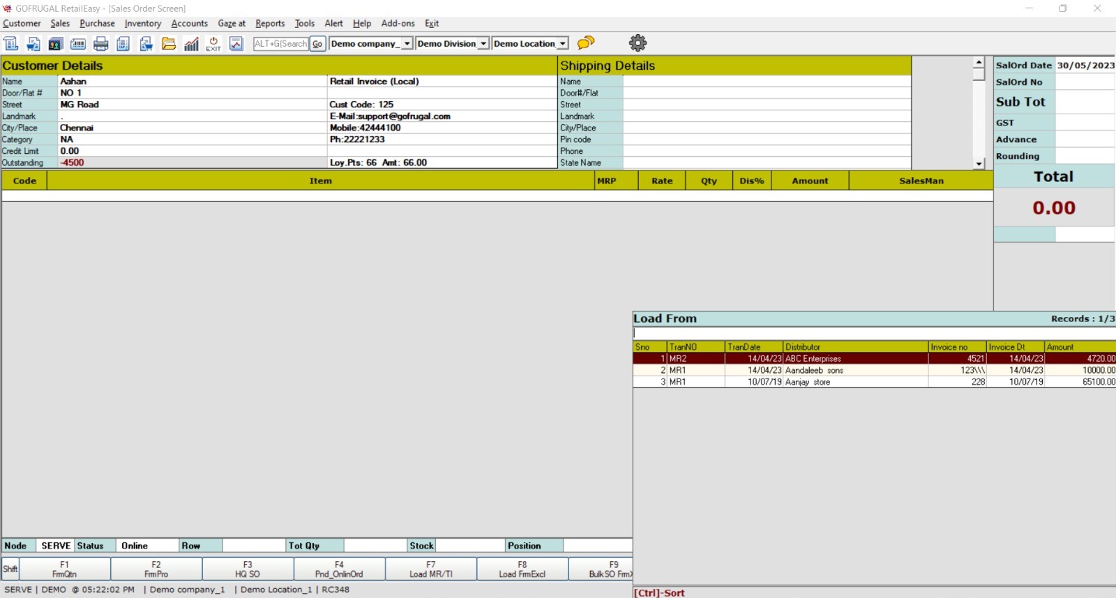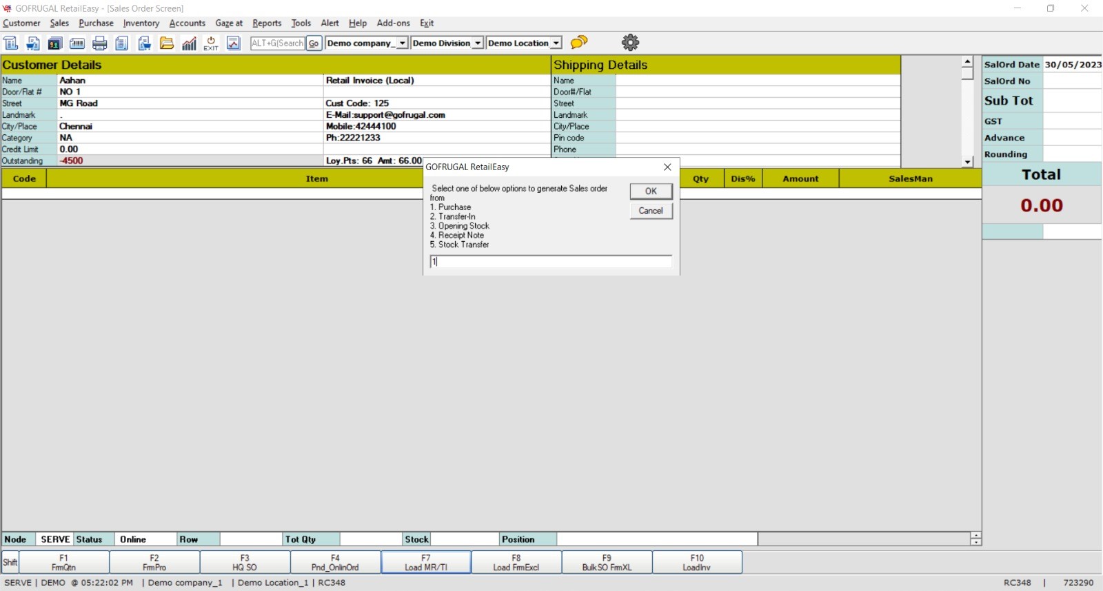 Step 2: Sales Order screen will appear. Click on 'Load MR/TI' function key. To generate the Sales Order from various segments to choose will appear. From the shown list, Press '1' and click Ok to Load SO from Purchase.