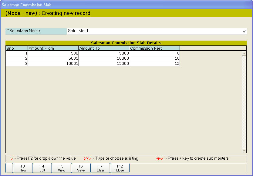 1. Click Sales >> Masters >> SalesMan Commission Slab to open the SalesMan Commission Slab screen.