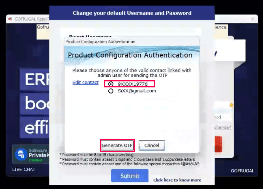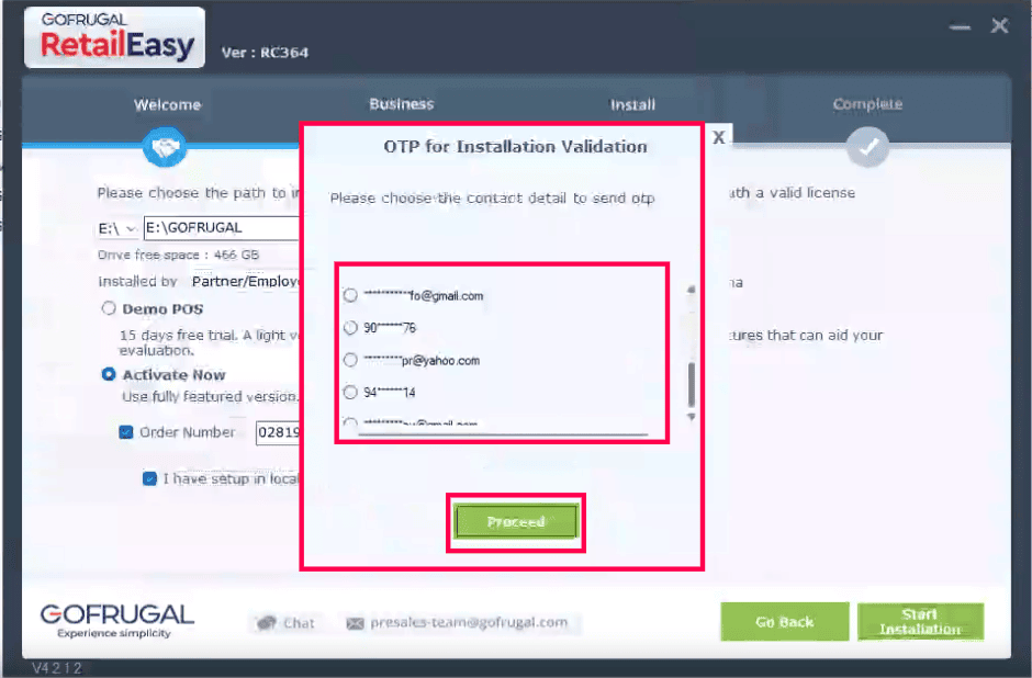 14. Installation validation OTP will be sent to the customer. Choose the contact details and click on the Proceed button.