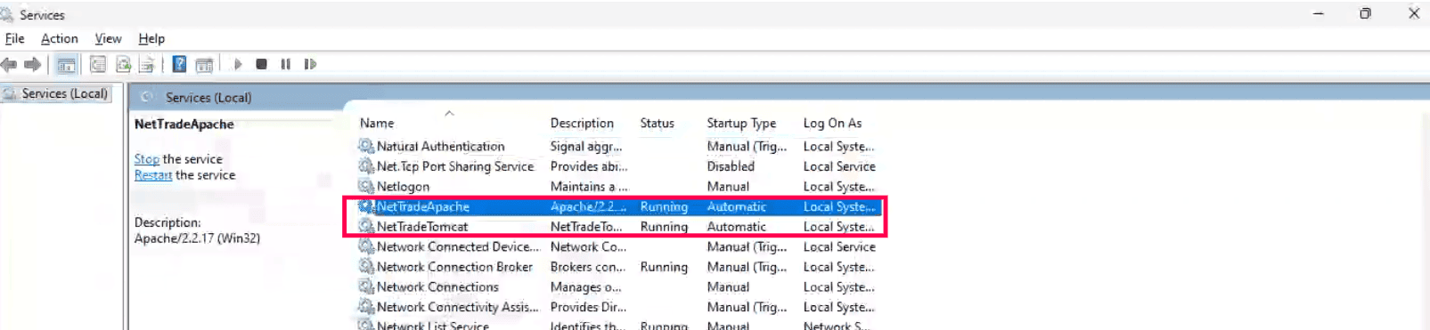 25. Restart the Nettrade Apache and Nettrade Tomcat services.