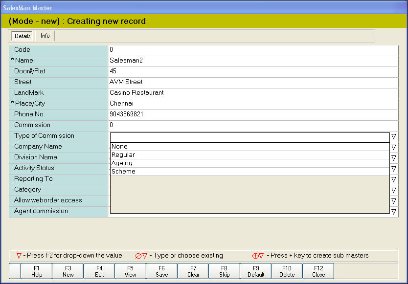 4. Click Save or press F6 to save the Salesman Master.