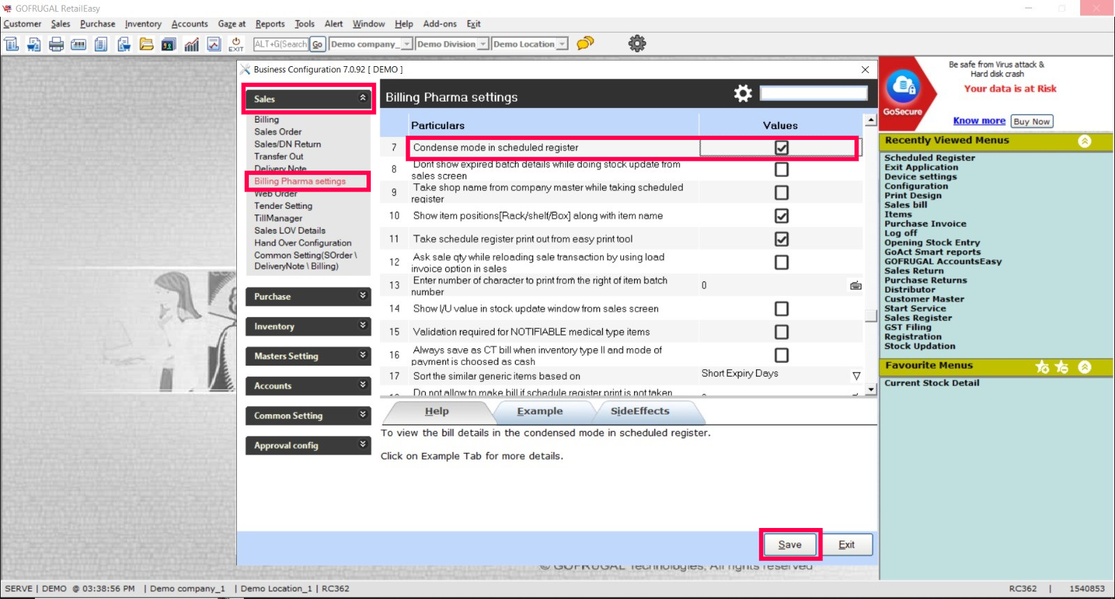 Step 2: Business Configuration screen will appear. Go to Sales > Billing Pharma Settings - Condense mode in Schedule Register (Enable the checkbox). Click Save.