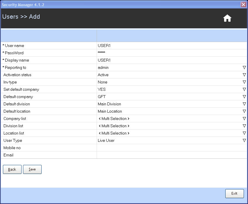 d. In the Reporting to the field, press ENTER or F2 key to select the name of the user to whom the new user will be reporting to