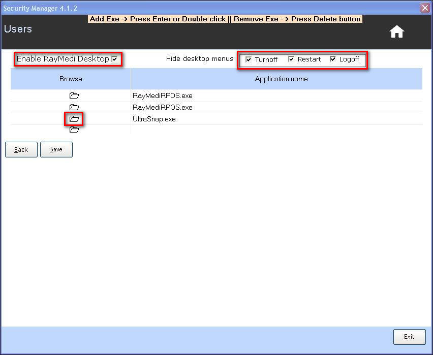 5. In the Browse column, click the Folder icon to select the other applications to be visible on the RayMedi desktop.
