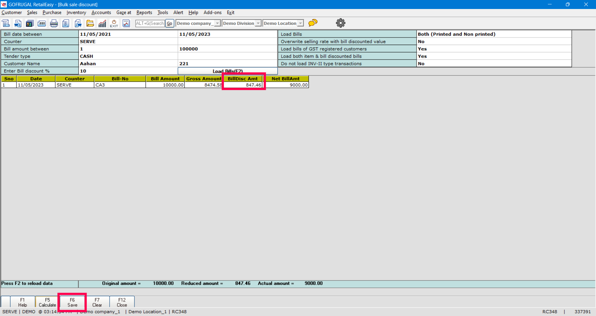 Step 4: BillDisc Amt will be reflected. Click Save.
