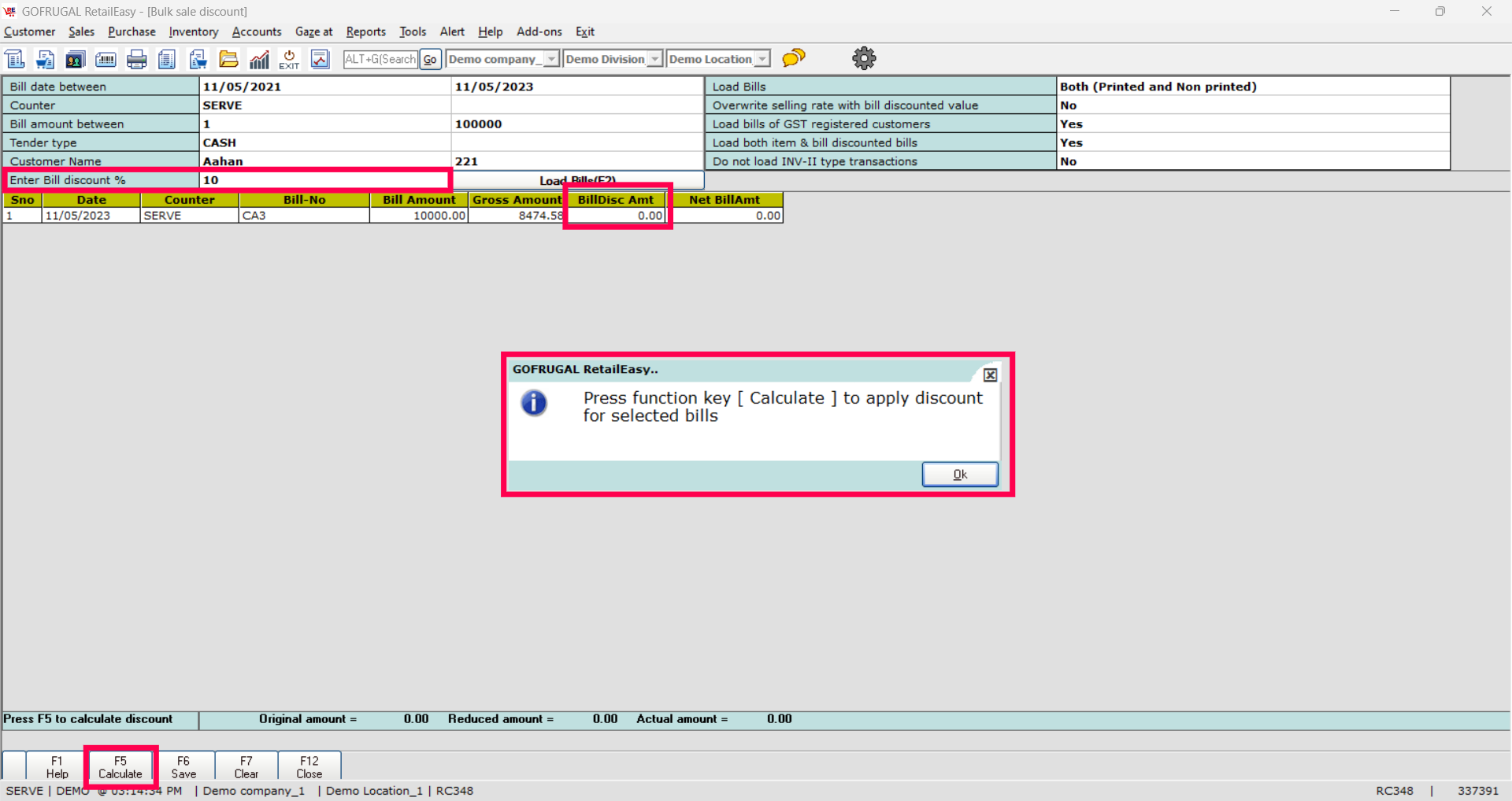 Step 3: Enter the Bill Discount % and click the Calculate function key to apply discount for the bill.