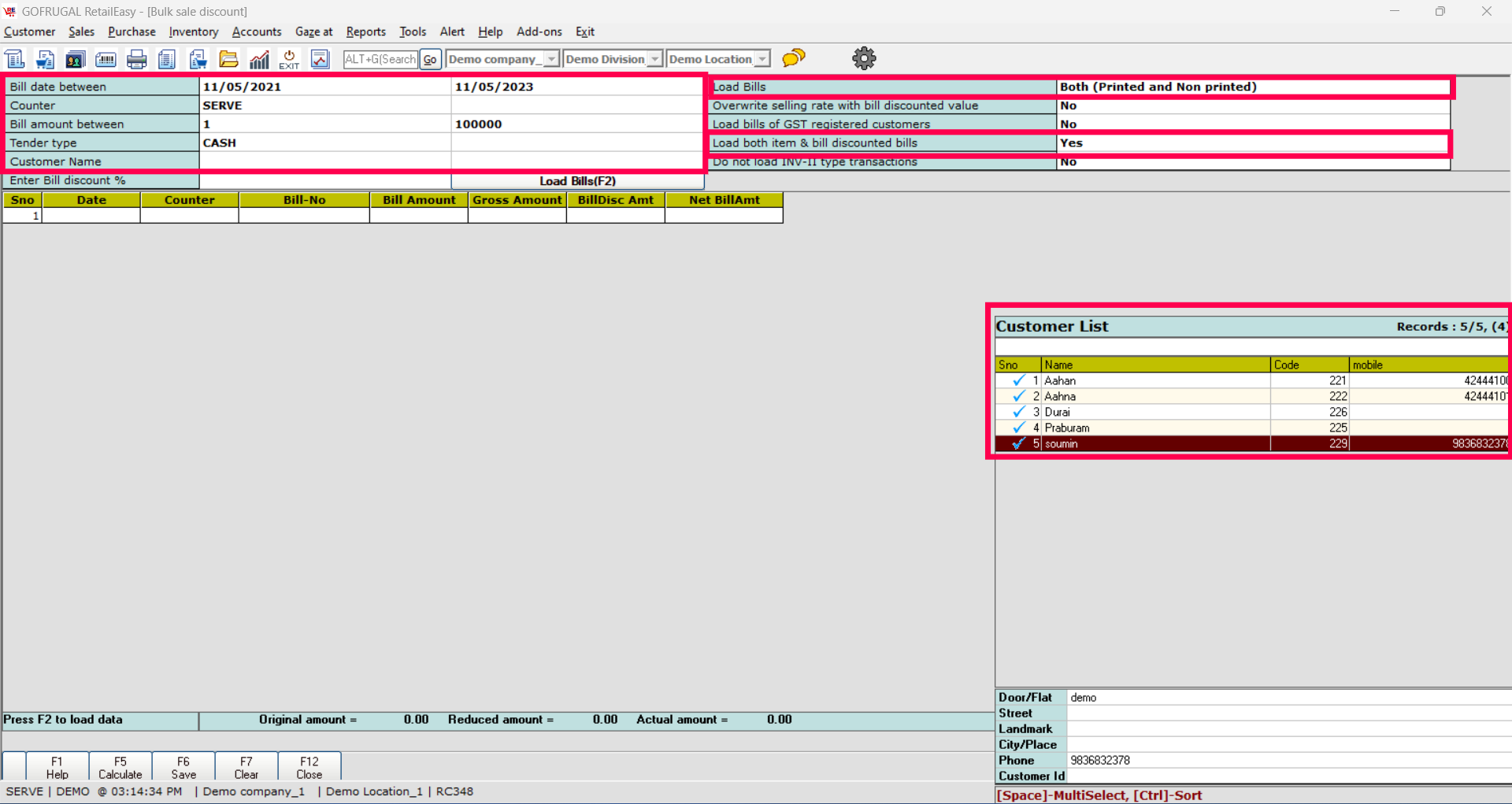 Note: Bulk Sale Discount is to give the discount in bulk for 'N' number of bills made to a specific customer in a specific period. The user is required to select the bills for a specific period and can give a discount in a single shot and the same is applied to all the selected bills. It is available as a custom license in the basic editions.