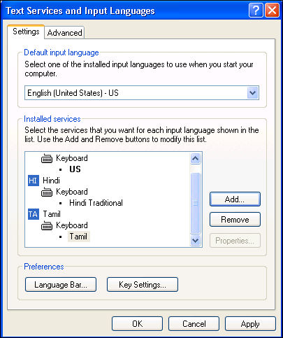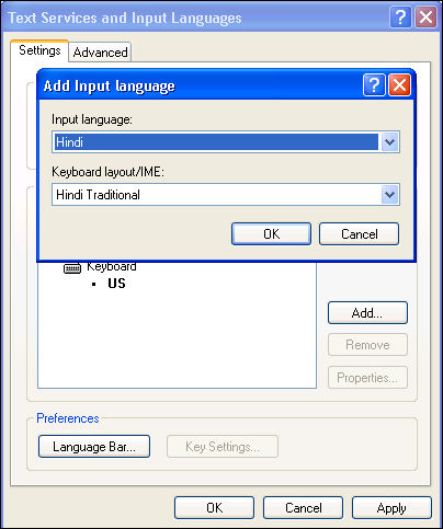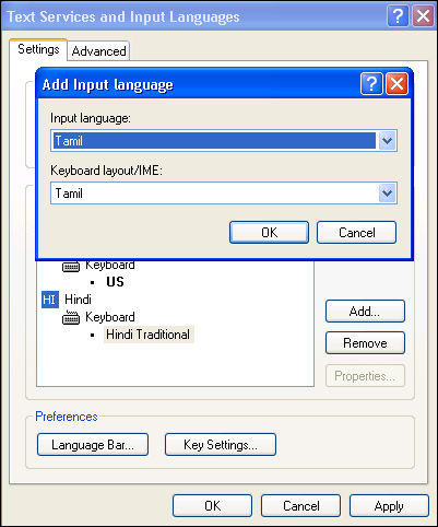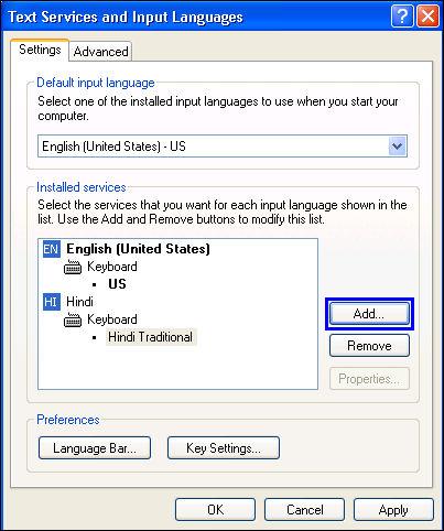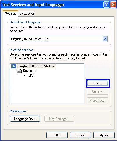 5. On the Settings tab, click Add to add more languages. The Add Input Language screen will be displayed.