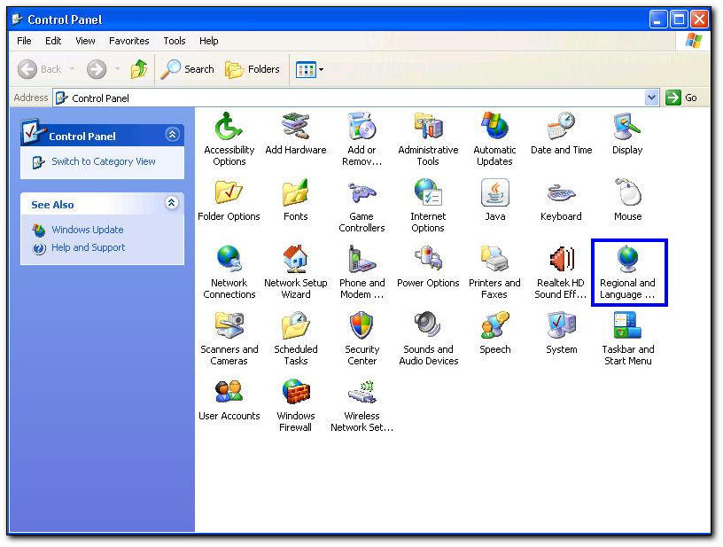 2. Click Regional and Language options. The Regional and Language options screen will be displayed.