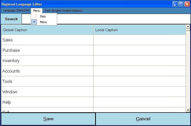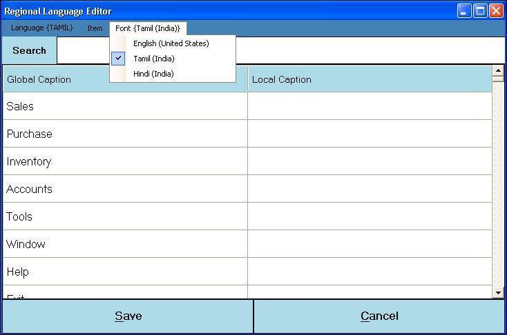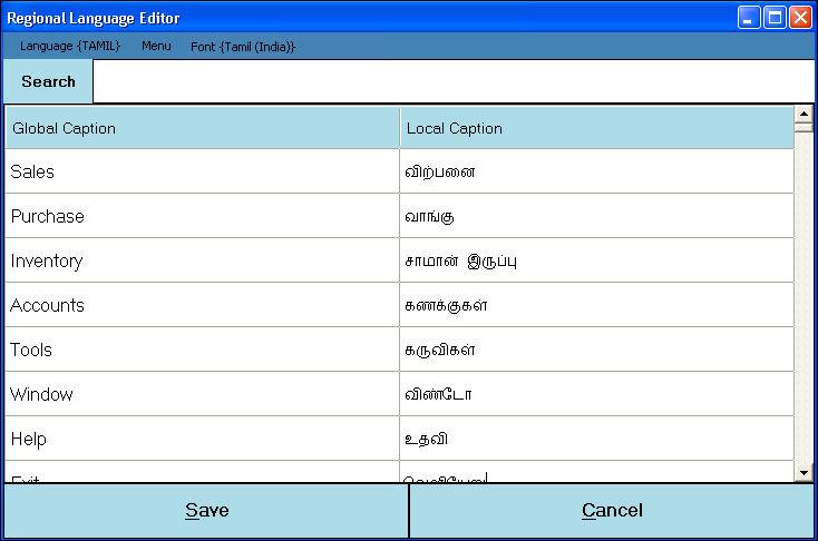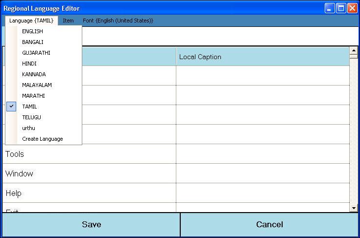 Editing the Item Names 1. Click Tools >> Miscellaneous >> Unicode Editor. 2. The Regional Language Editor screen will be displayed. 3. Click Item >> Item to edit the Item names. 4. Click font and select the required regional language from the ...