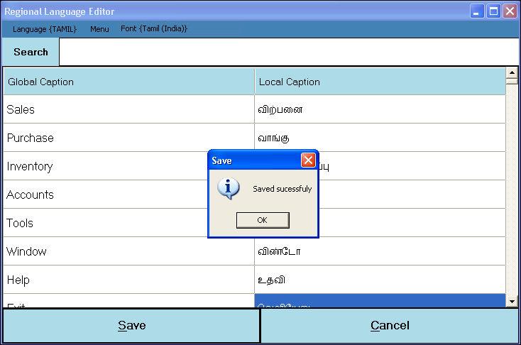 7. Click OK to exit. The saved changes will be reflected in the screen where the menus will be displayed in the selected regional language.