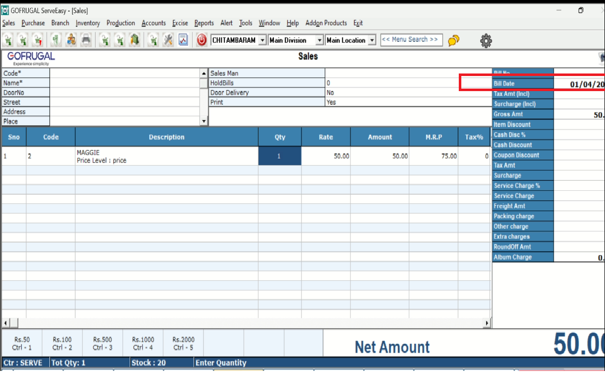2. Create a new Sales Bill. The first invoice issued after the start of the year will be designated as Bill Number 1.