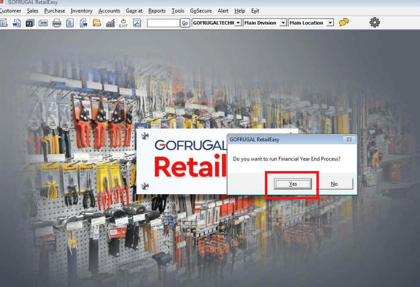 Immediately after login, a pop-up message will appear, "Do you want to run Financial Year End?"