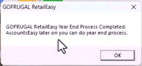 Clicking YES triggers a message: "GOFRUGAL RetailEasy Year End process completed. For AccountsEasy, you can do the Year End process later."