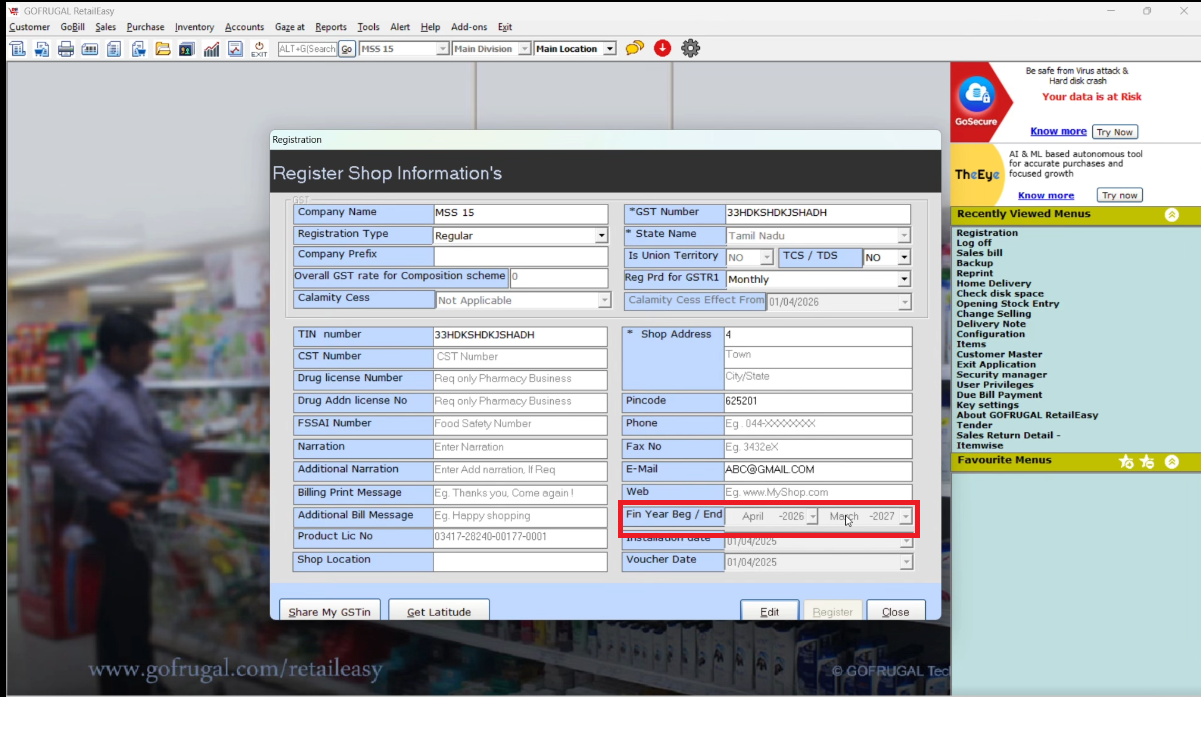 In the Registration Master, confirm that the Financial Year Begin/End is set to April 2026 - March 2027.