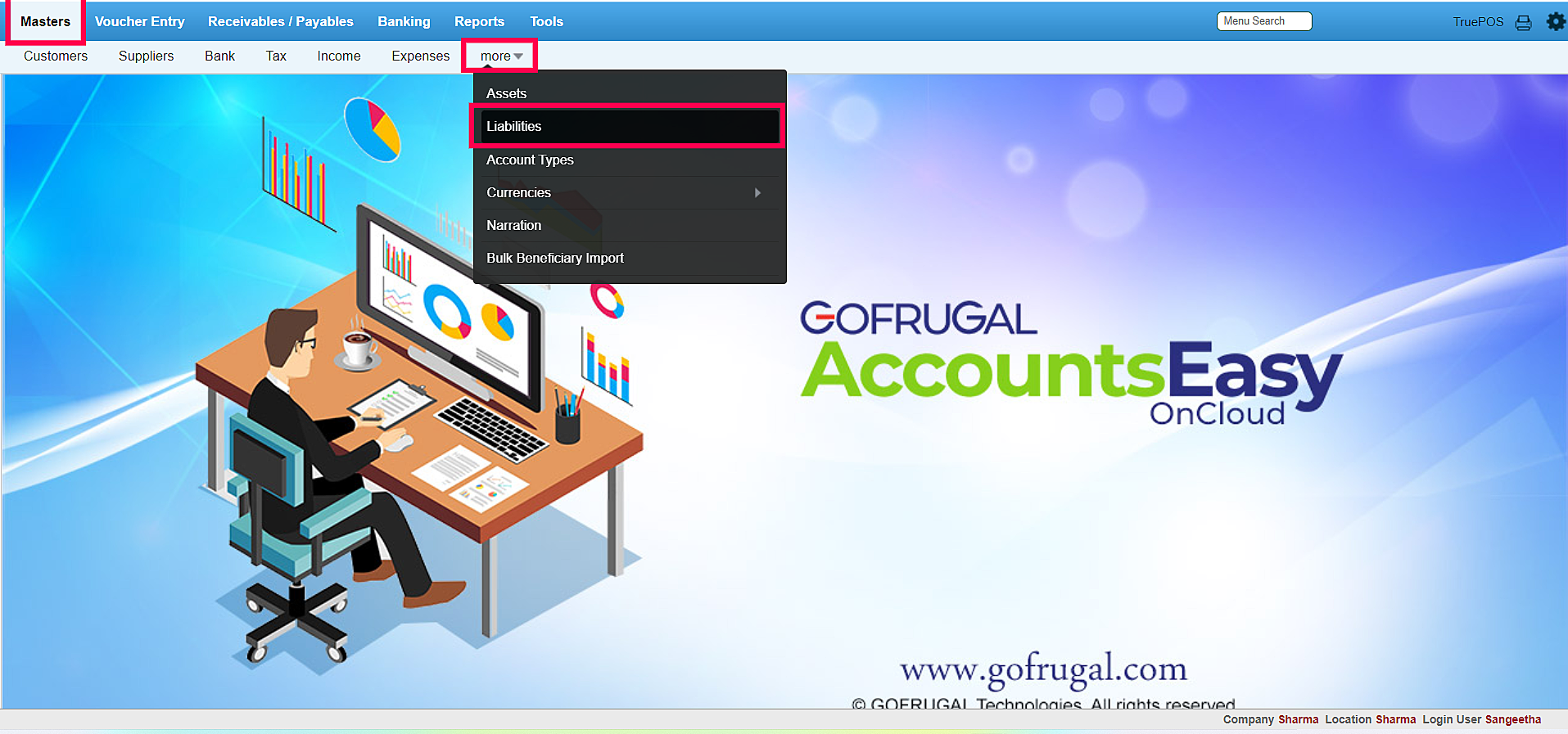 Step 1: Select Master > More > Liabilities under Finance & Accounts module.
