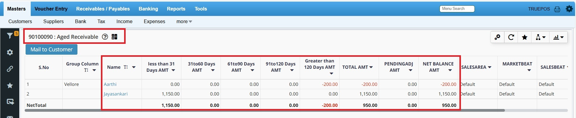 The Aged Receivable report shows how many days a receivable amount is pending against a credit sales bills.