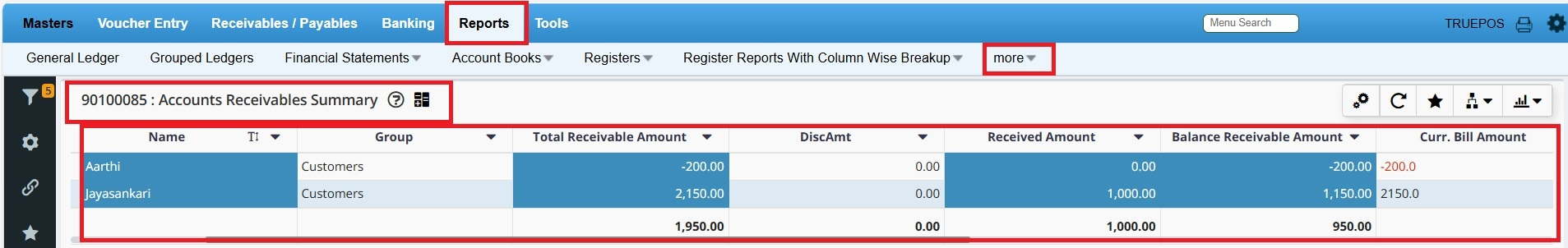 The Accounts Receivable Summary report displays the customer wise receivable summary.